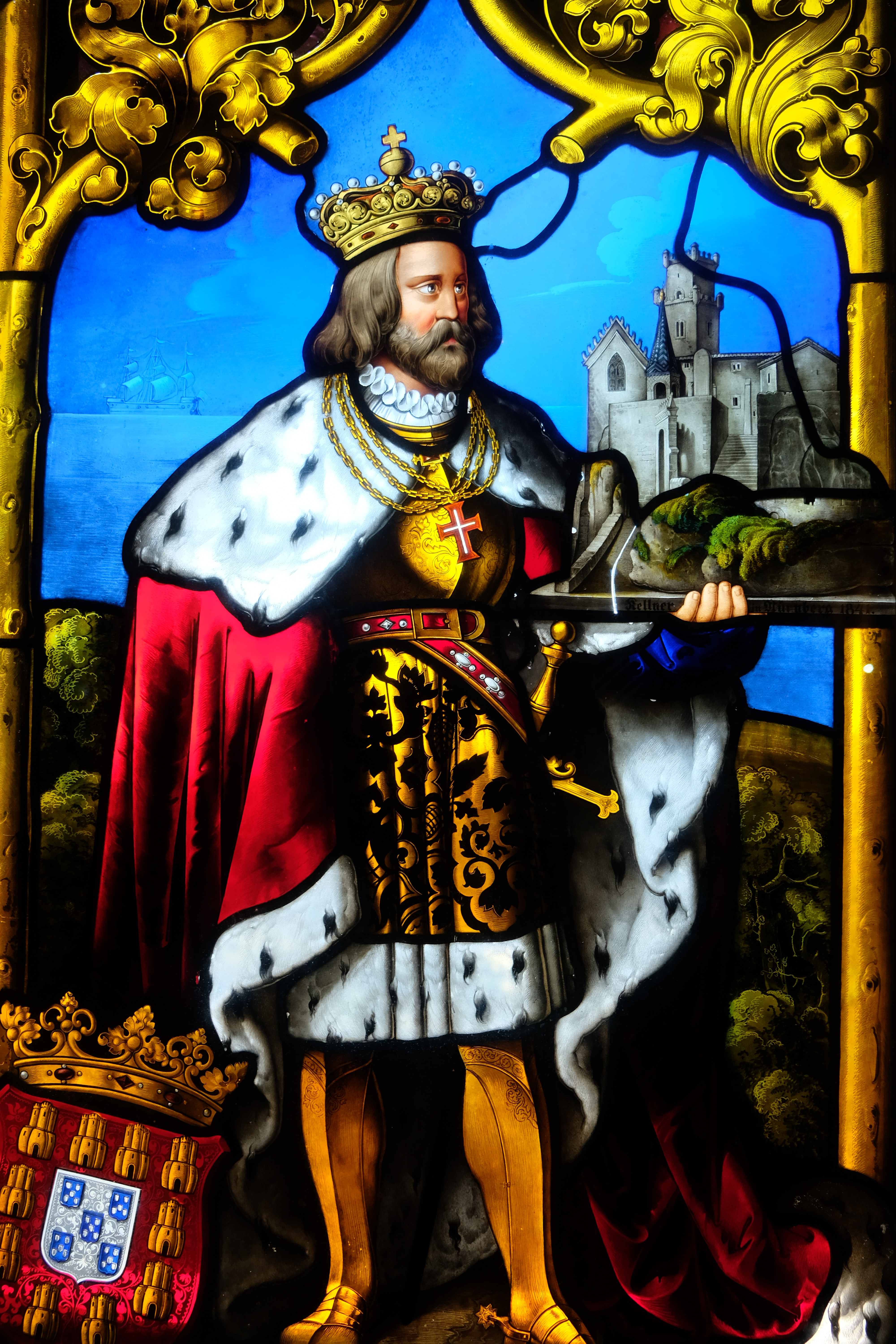 아주 흥미로운 점은 바로 마누엘 1세의 뒷편에 있는 성입니다. 성에 있는 창문을 아주 유심히 쳐다보면
