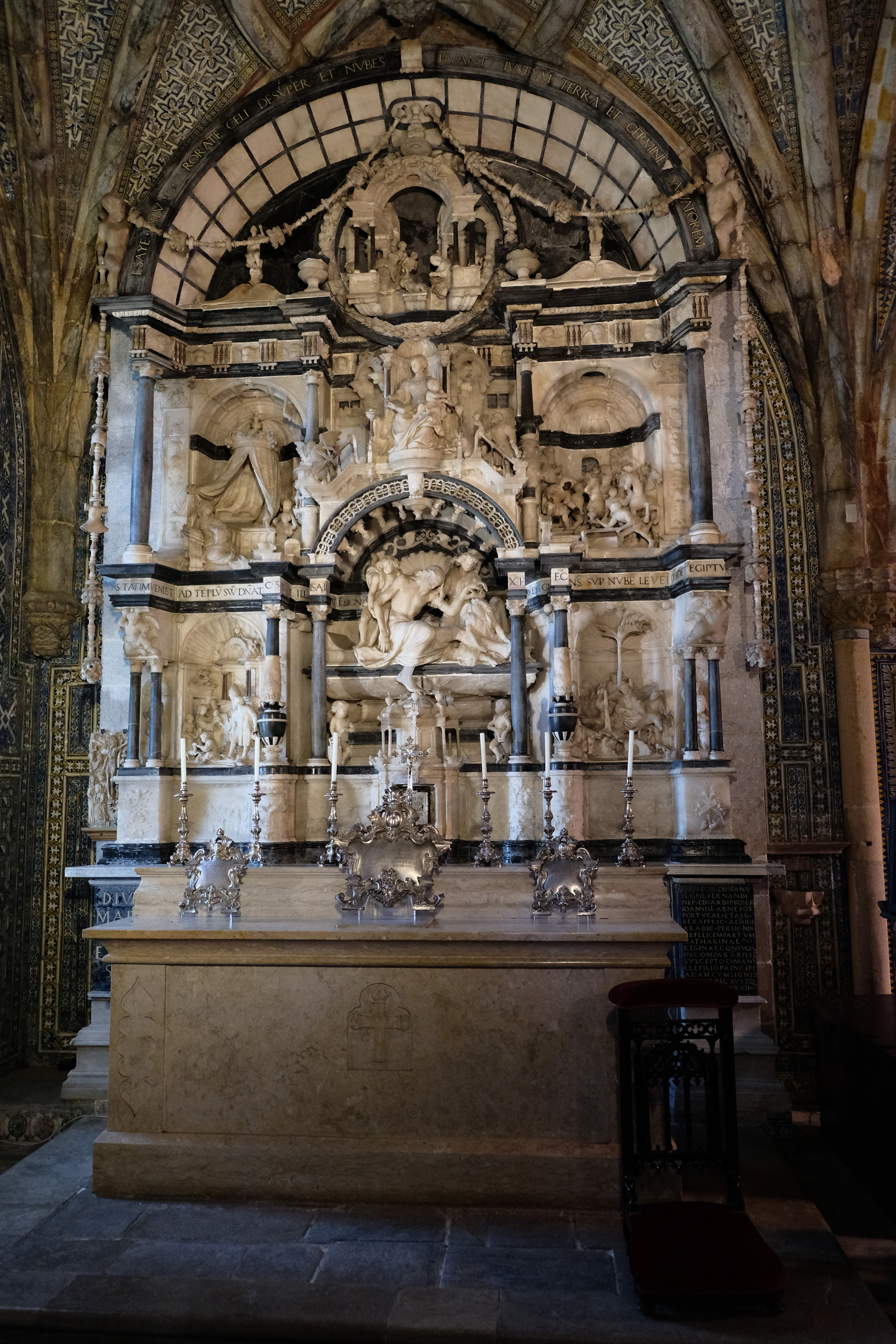 입구에는 작은 스테인드 글라스가 있고프랑스의 조각가 랑스 조각가 Nicolau de Chanterene가 1532 년에 제작한 제단입니다.무엇보다 주목하셔야 하는건 입구에 있는 이 스테인드 글라스입니다. 1840 년 D. Fernando가 뉘른베르크의 Kellner에게 의뢰 한 신 고딕 양식의 창문에 스테인드 글라스로 1503 년 페냐 수녀원 창립의 내용을 담았습니다. 왼쪽 아래에 왕관을 쓰고 있는 남자는 대항해시대의 포르투갈의 왕 마누엘 1세이고 그 오른쪽 칸은 벨렘탑을 배경으로 한 바스코 다 가마입니다.