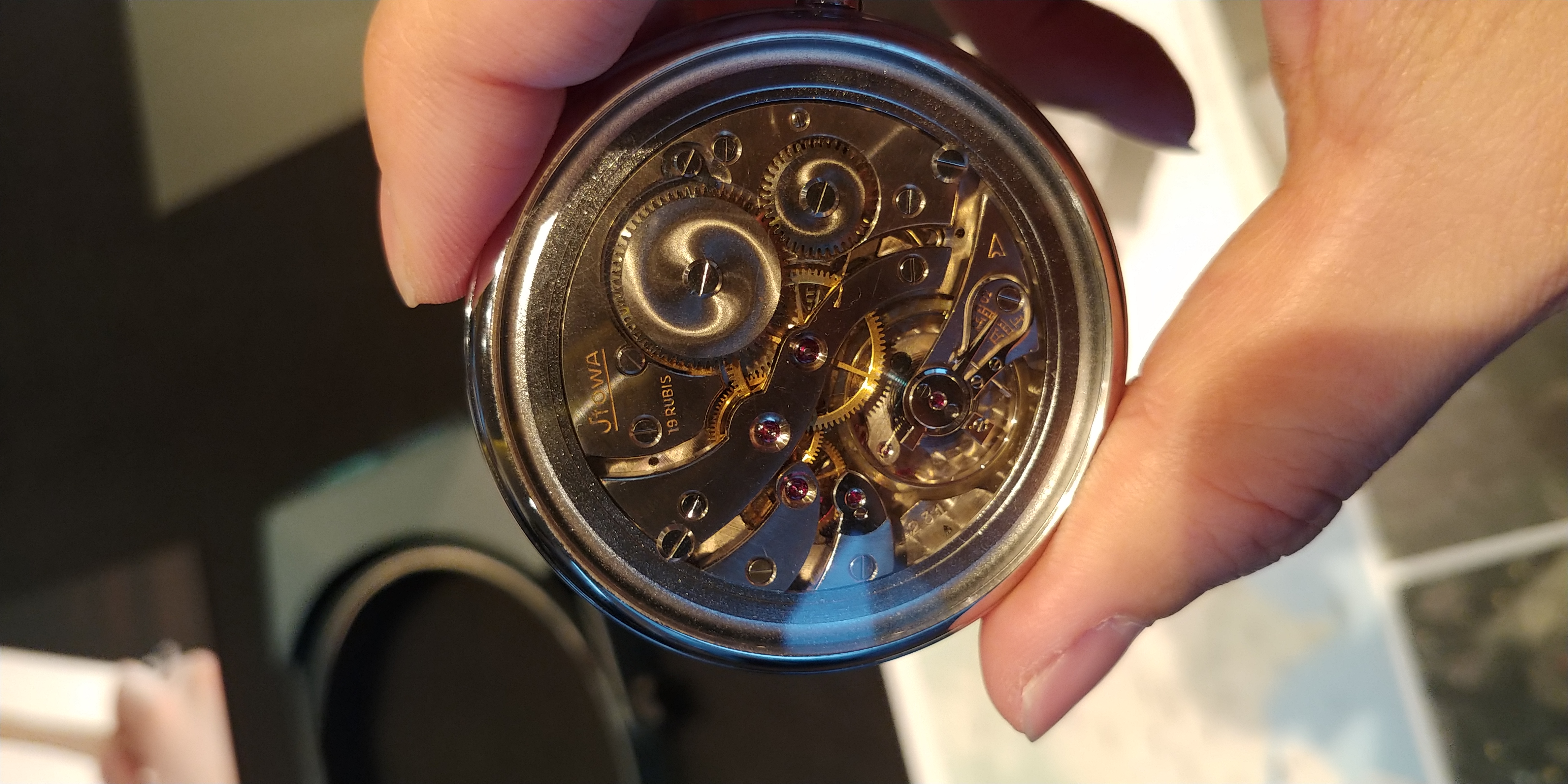 한켠에는 엄청나게 큰 회중시계가 놓여있었습니다. 거의 손 안에 꽉 차는 크기입니다.무려 1942년에 만들어진 STOWA 마린 워치입니다!! +_+무브먼트는 유니타스 2218이군요! 뒷면.. 뒷면을 보자!!