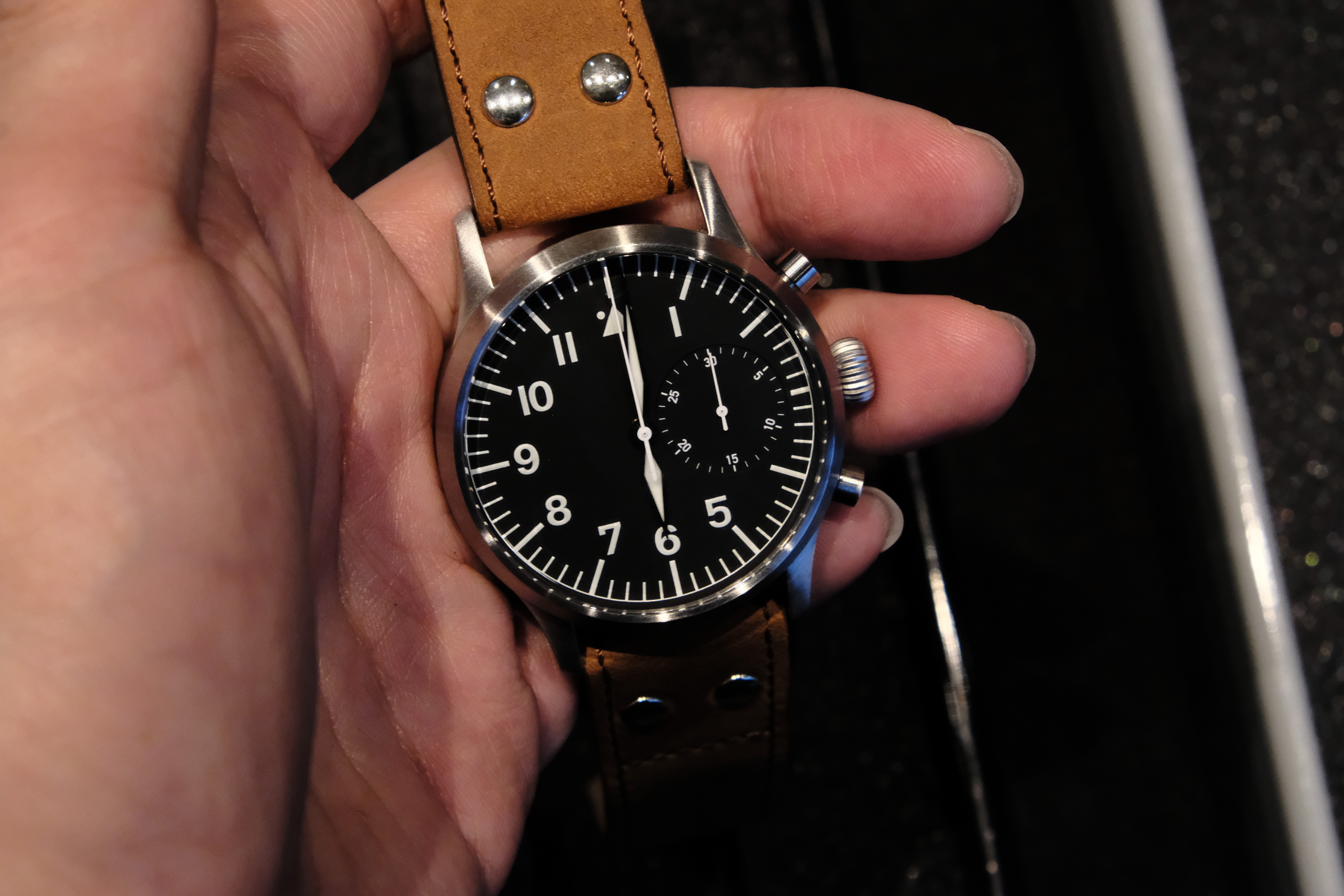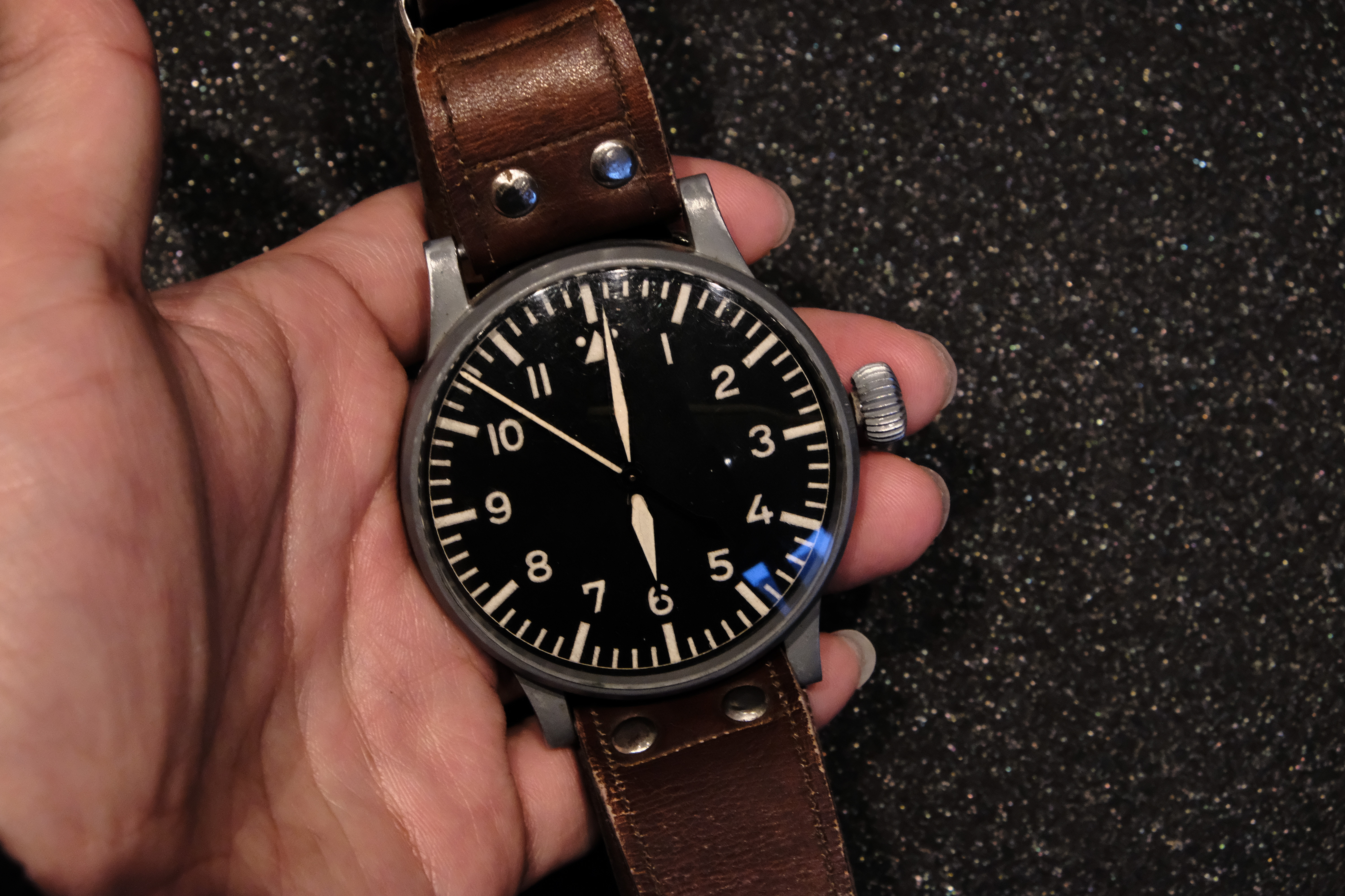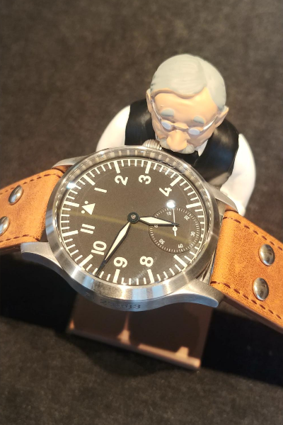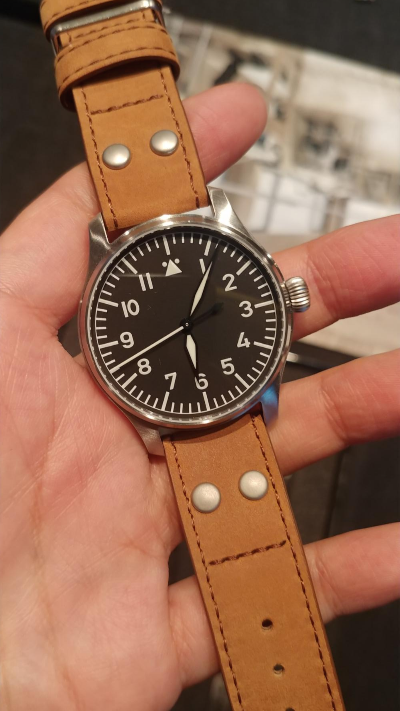 수많은 플리거 모델들도 있었습니다. 특히 오른쪽에 저 오래된 플리거 모델은 브랜드명이 없고, 케이스나 가죽 스트랩의 크기로 보아 실제로 2차 세계대전 때 파일럿들에게 납품된 STOWA Fliegeruhr 모델로 보입니다. 1940년, 55 mm 케이스, 유니타스 2812사용했습니다.크기는 이정도입니다; 연식은 있지만 당연히 잘 작동하고 있습니다.플리거 클래식 모델입니다.플리거의 컨템포러리 라인업인 플리거 DIN 프로페셔날입니다. 원형의 날짜창과 울퉁불퉁한 베젤이 인상적입니다.