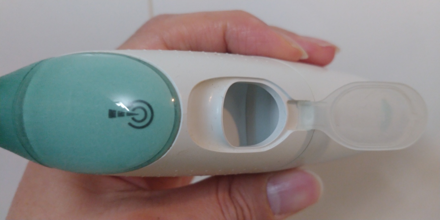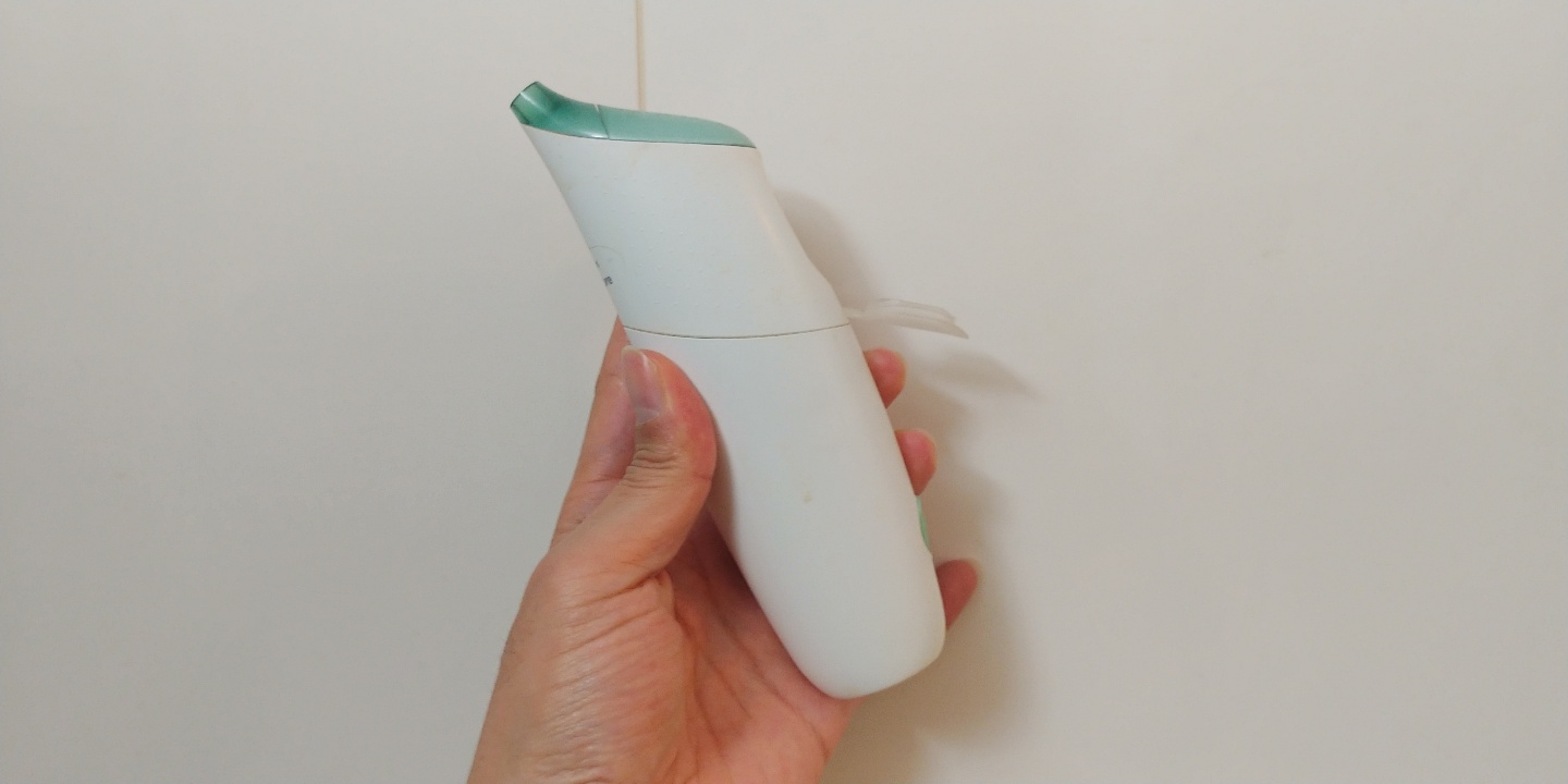 에어플로스는 작동하면 물이 계속 나오는 일반적인 워터픽과 달리 상단 버튼을 누를 때만 물이 '발사'되는 시스템이라 물의 소모가 적은 편입니다.