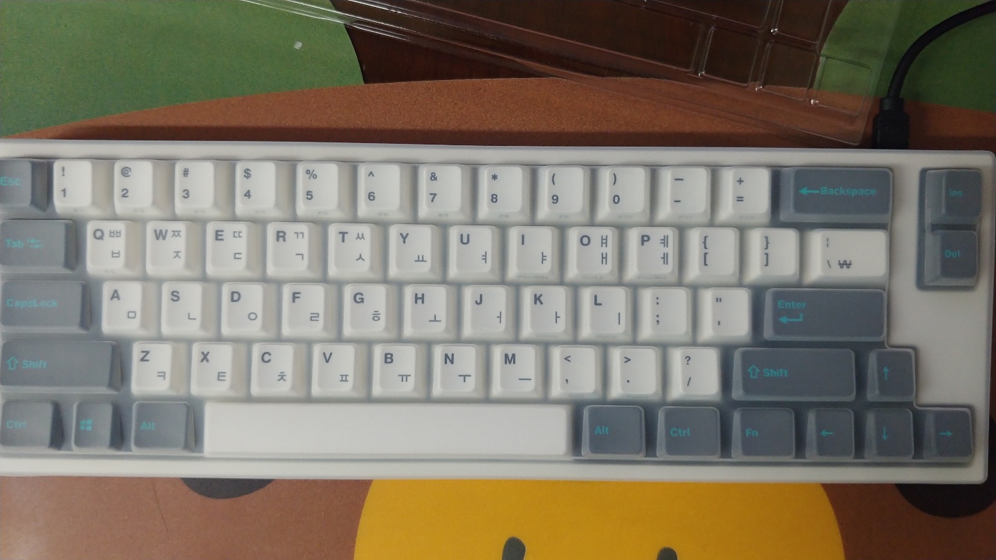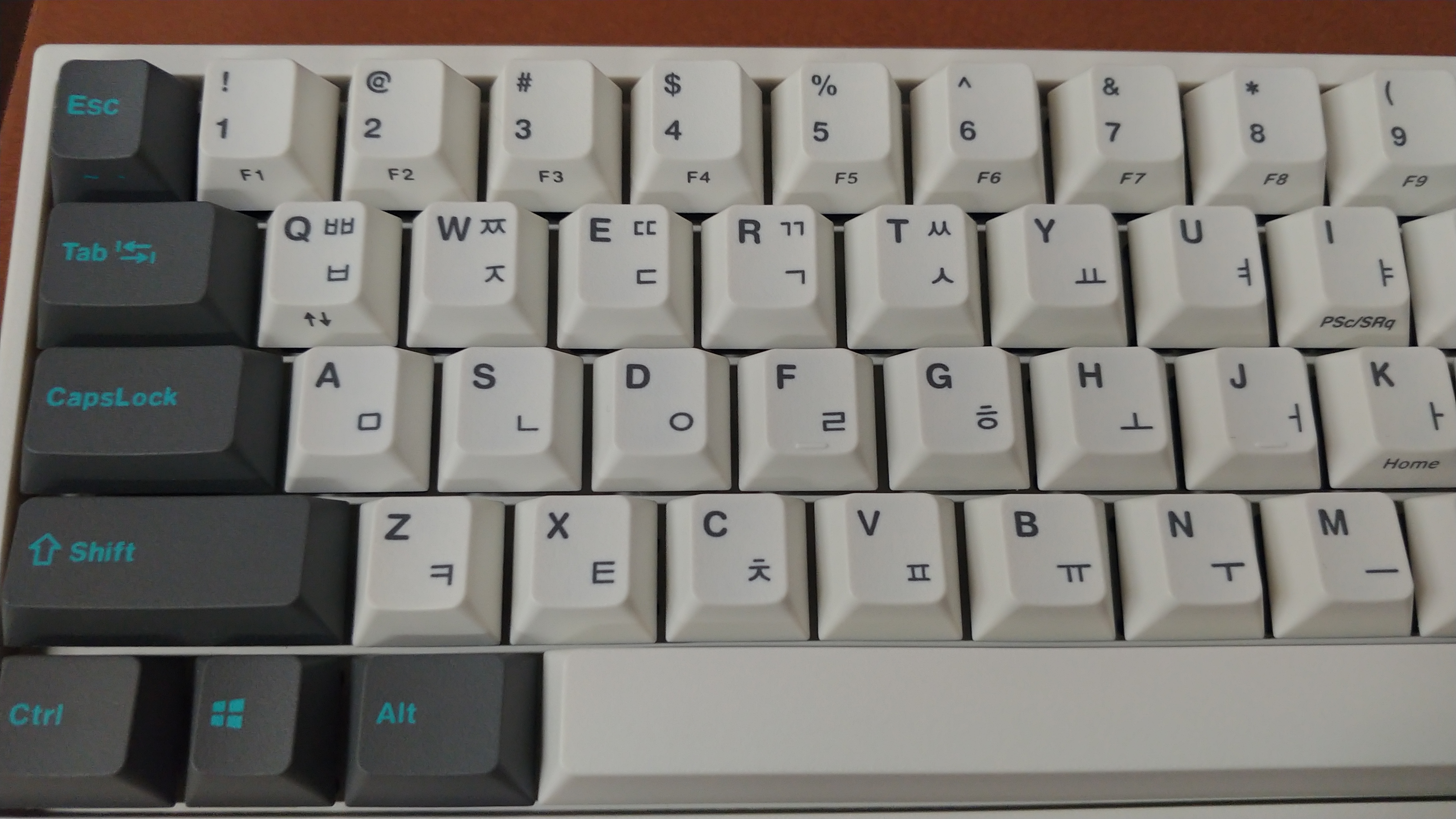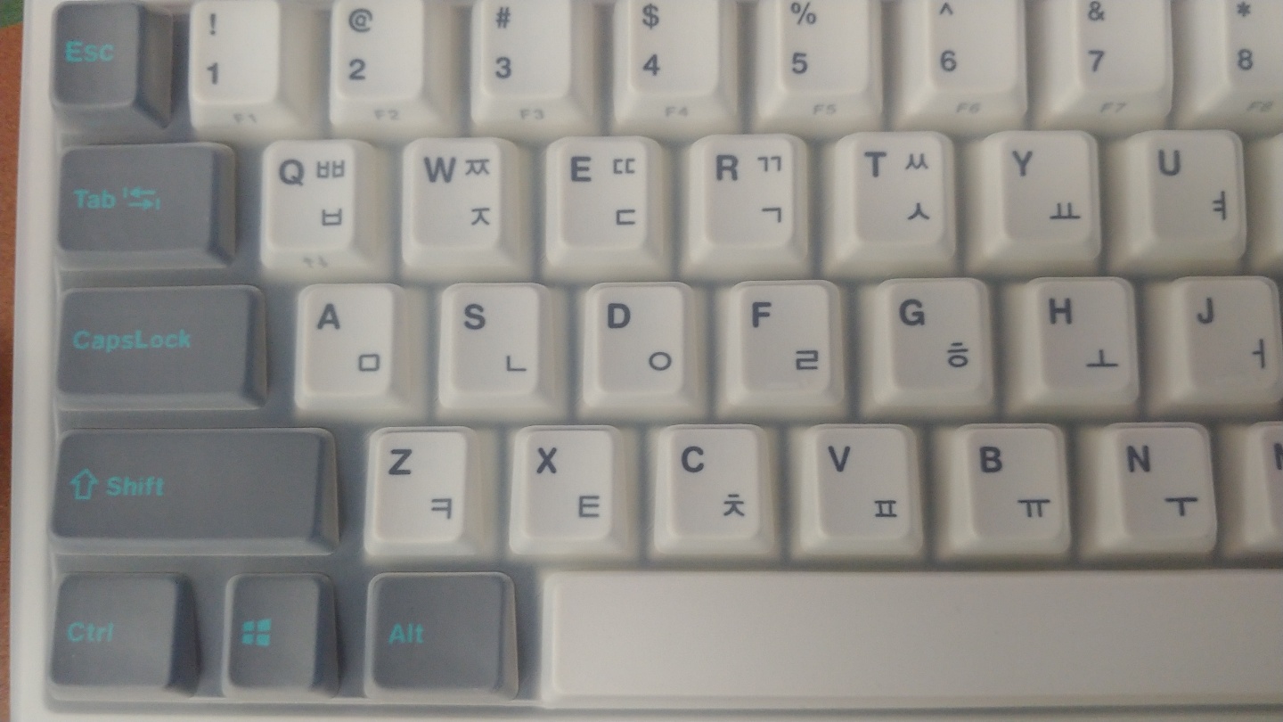 전체적으로 문자키는 화이트, 기능키는 그레이에 문자색은 검정색 기능키의 문자는 하늘색으로 상당히 독특한 색 배열을 가지고 있습니다 .