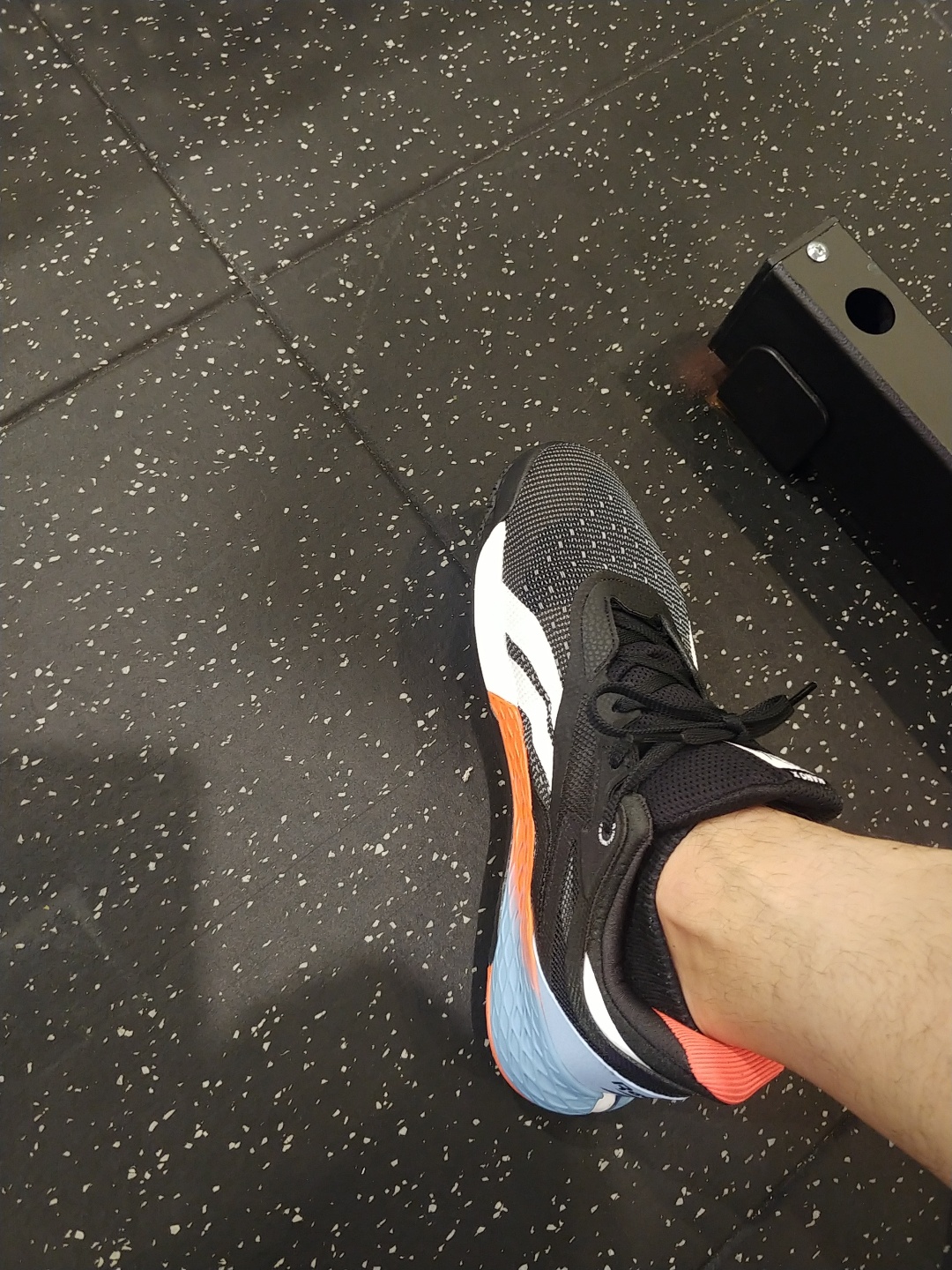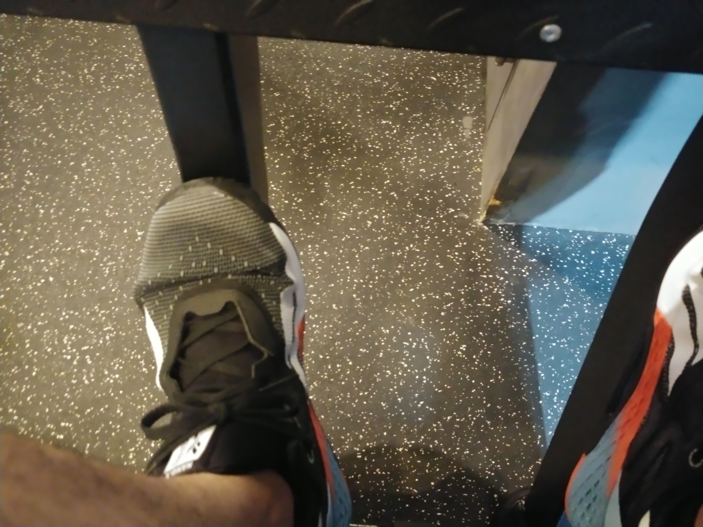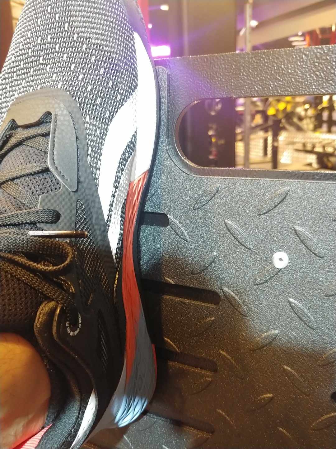 랫 풀다운을 하다 쉬고 있는 제 눈에 바로 앞에서 두툼한 쿠션이 들어있는 러닝화를 신고 데드 리프트를 하던 다른 회원님의 발이 눈에 들어옵니다.