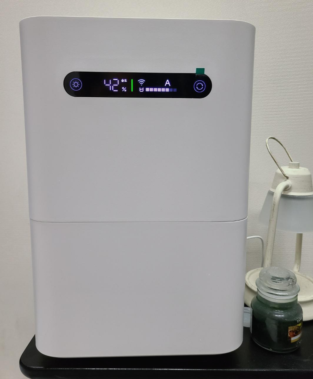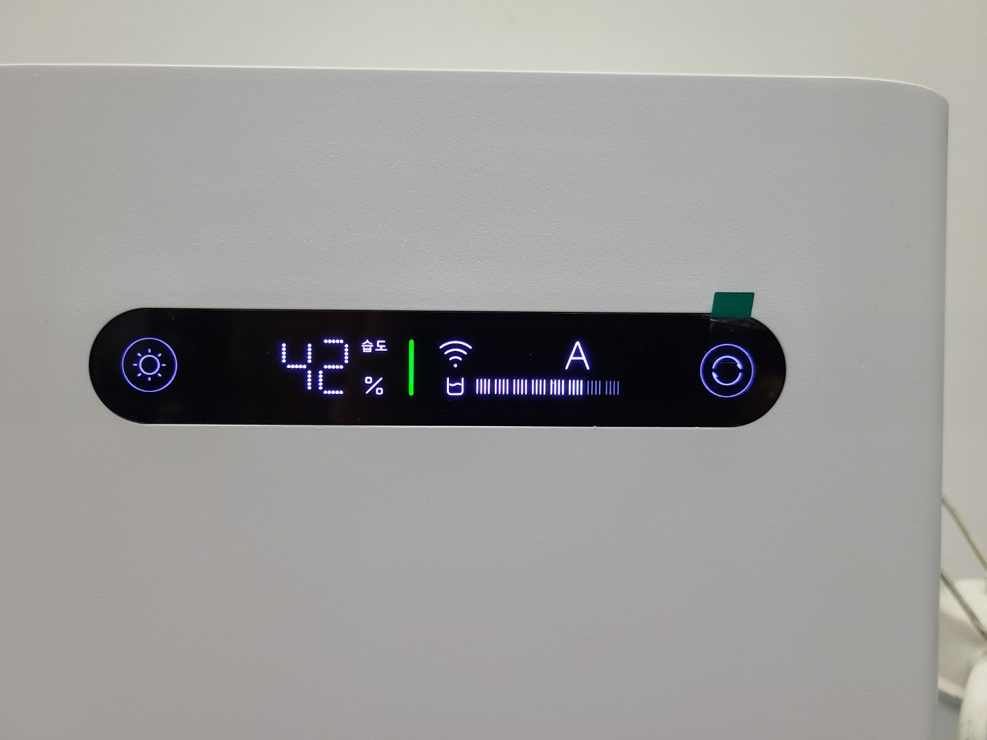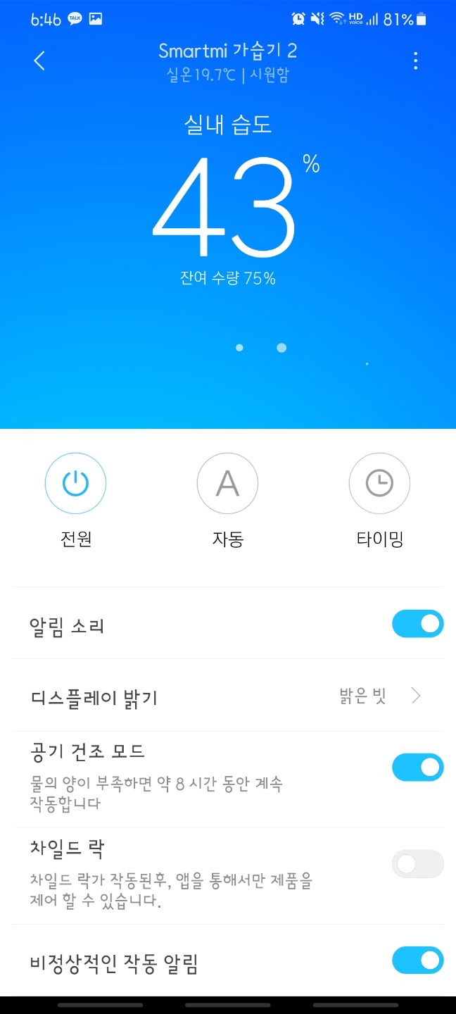 왼쪽에는 습도를 %로 표시해주고, 오른쪽에는 와이파이 연결 여부, 현재 작동 모드, 물통에 남은 물의 양을 이미지로 보여줍니다.