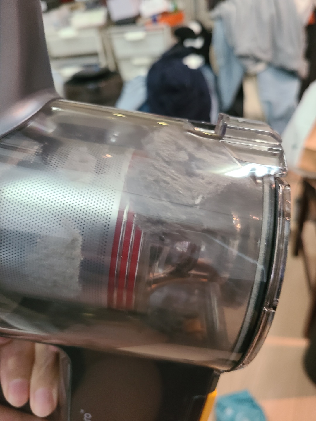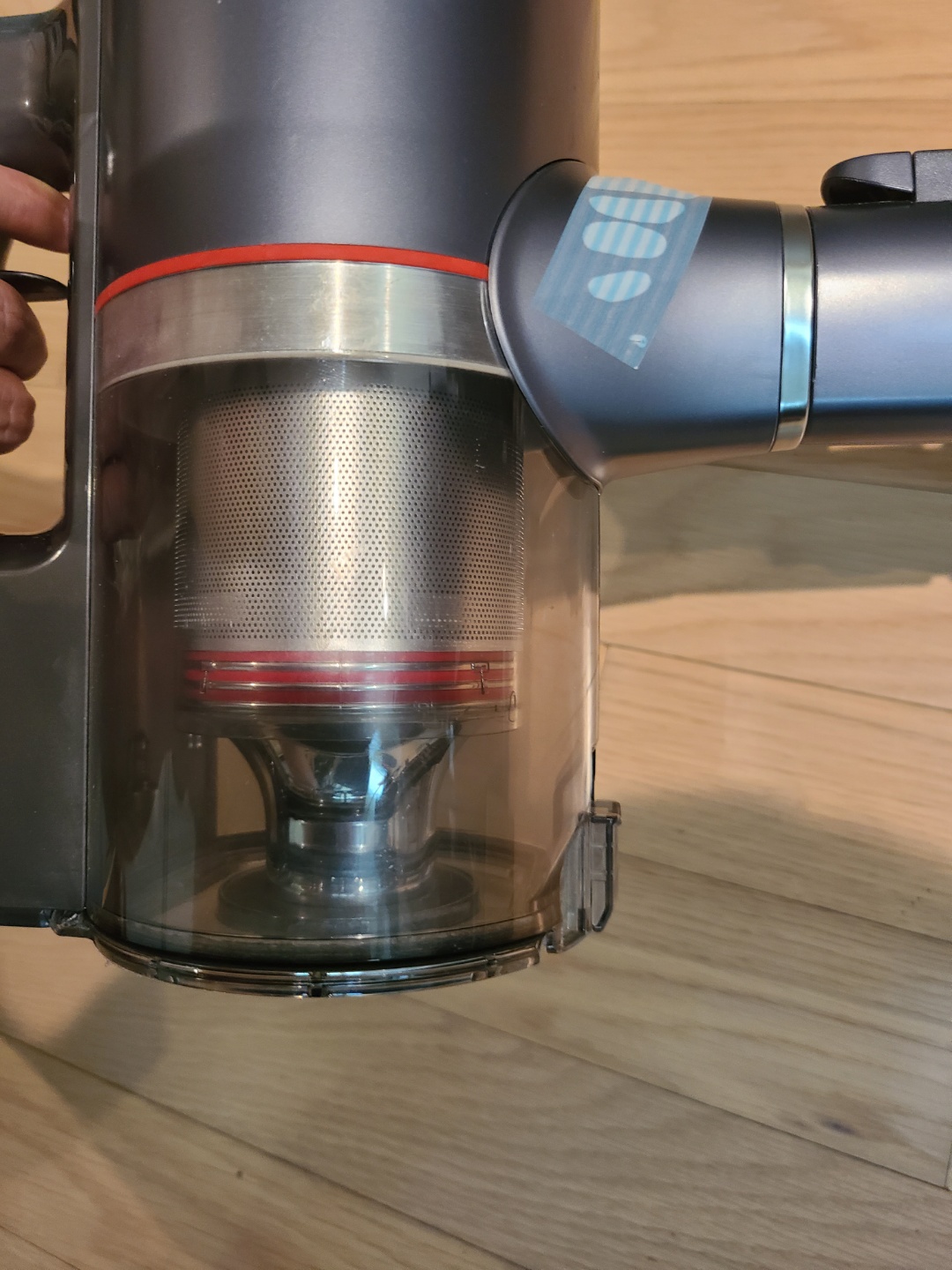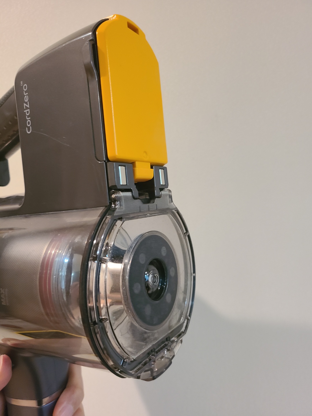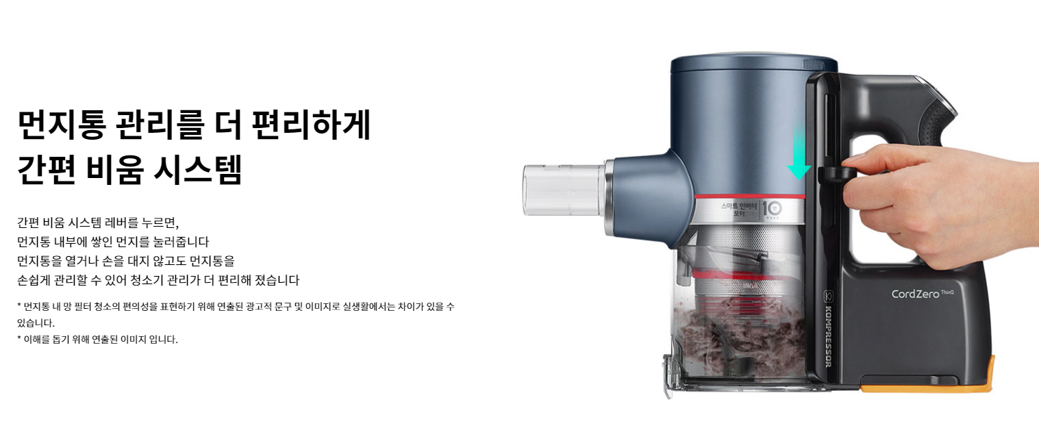 유선 청소기보다 먼지통이 적어서 자주 먼지통을 비워줘야 하고 싸이클론 방식을 채택하다보니 고운 먼지들이 많이 들어차는데 먼지통 열림 방식이 아래로 턱~! 하고 열리는 방식이라