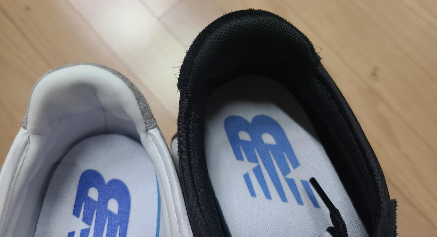 뒷꿈치쪽 스웨이드 갑피의 절개 보양이 다릅니다.