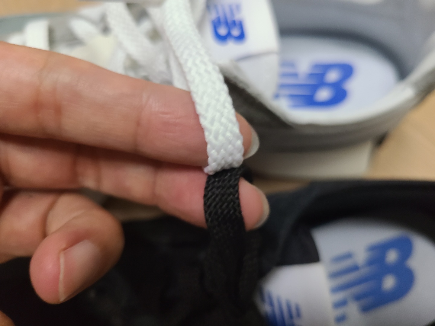 만져보면 327 그레이의 신발끈이 조금 더 고급지고 짜임새 있으며 살짝 도톰한 느낌입니다.
