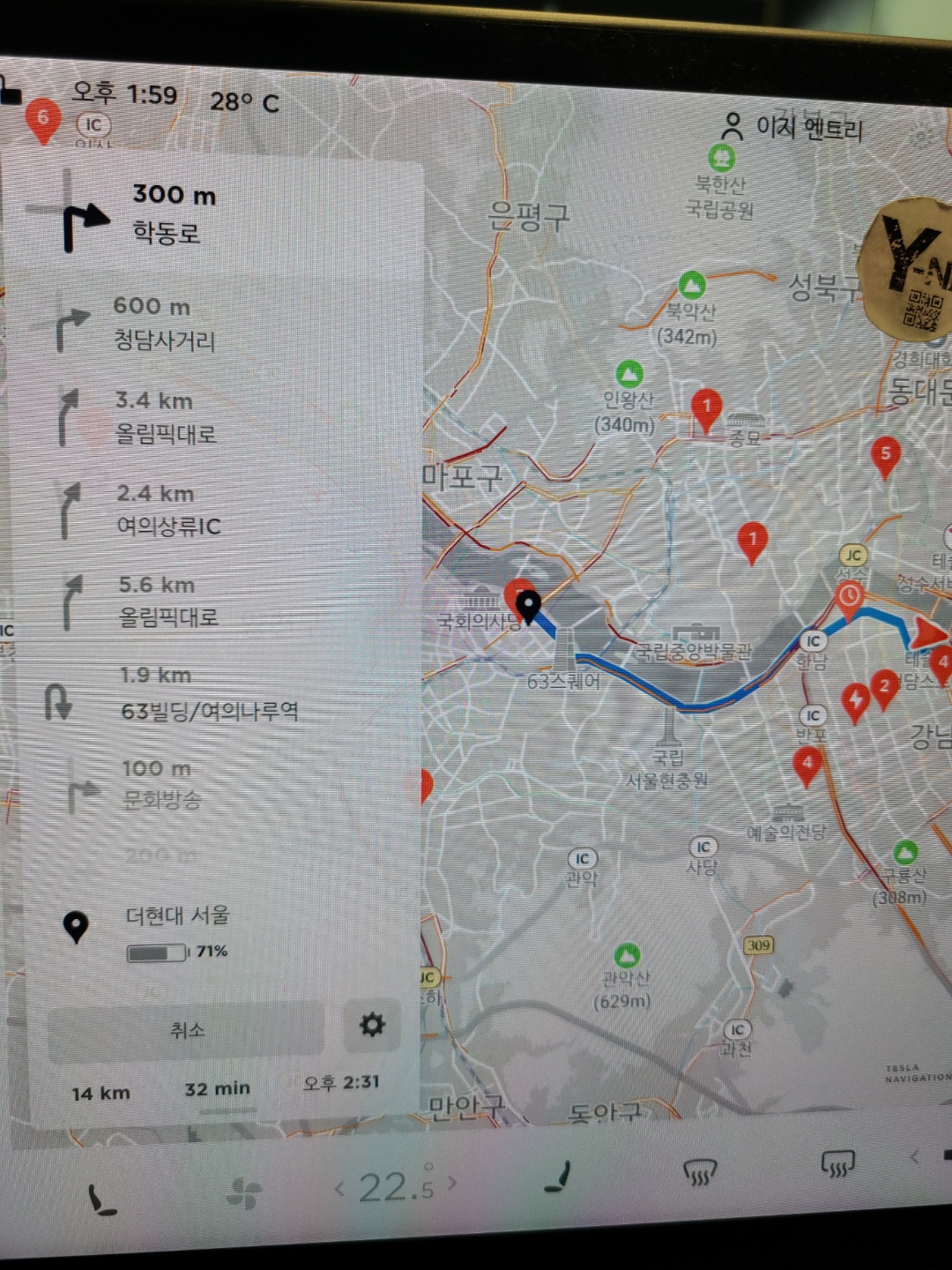 중앙 모니터에 표시되는 주변 차량들의 상황은 매우 기민하고 그 상황에 따른 차량의 움직임도 즉각적이어서 우측 차선 변경을 하려고 깜빡이를 켠 상태에서 후측방에 있던 차량이 존재하자 차선 변경을 하지 않고 있었는데, 해당 차량이 다른 차선으로 이동하는걸 인지하자마자 기민하게 차선 이동을 하는 모습이 매우 인상적이었습니다. 차량이 조금만 막혀도 오토파일럿을 켜고 싶겠다는 생각이 확 들었습니다.