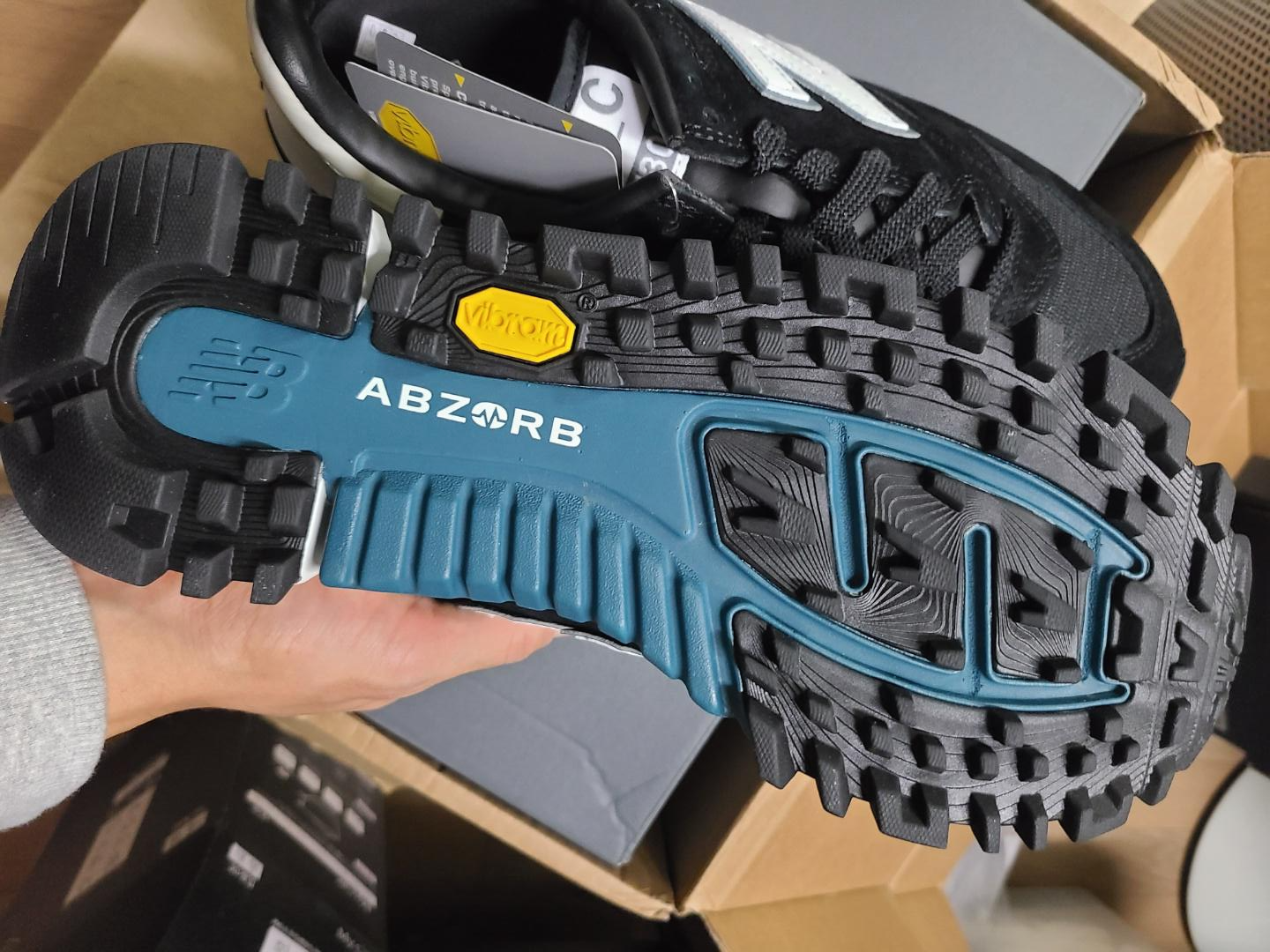 두 아웃솔의 높이가 미세하게 달라서 ABZORB는 조금 떠있고, 비브람이 더 돌기가 높게 솟아 있습니다.