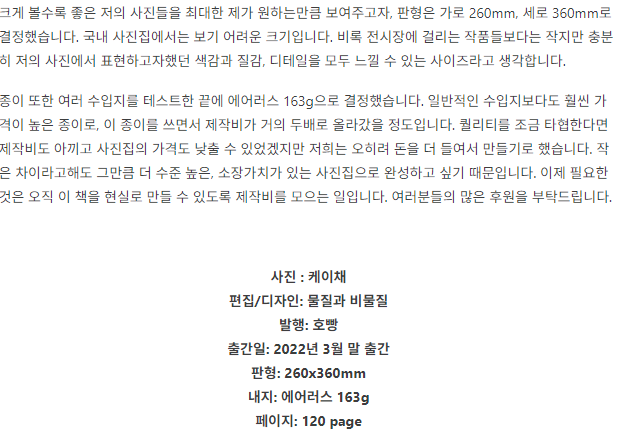 펀딩 내용에 사진집의 퀄리티에 대한 욕심을 말씀하셨는데, 충분히 펀딩할만한 가치가 있는 사진집이었다 생각합니다.