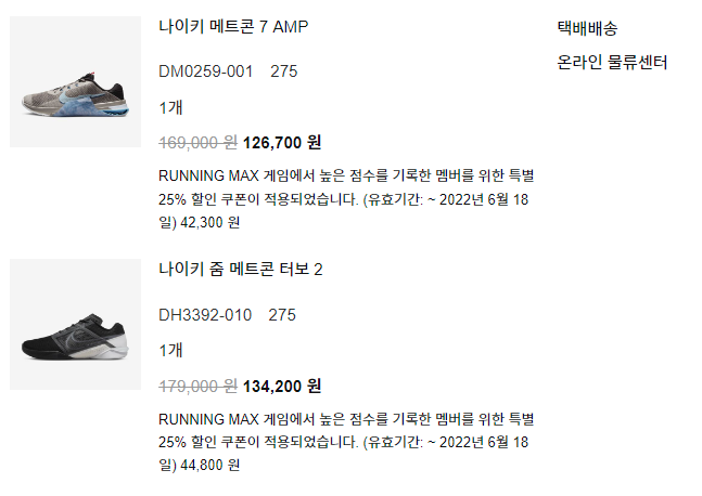 나이키 메트콘7과 나이키 줌 메트콘 터보2를 모두 신어본 후 저의 결정은 '둘 다 반품'이었습니다. 메트콘7은 오른쪽 발등이 불편해서 계속해서 신경이 쓰였고 줌 메트콘 터보2는 뒤꿈치쪽 쿠션