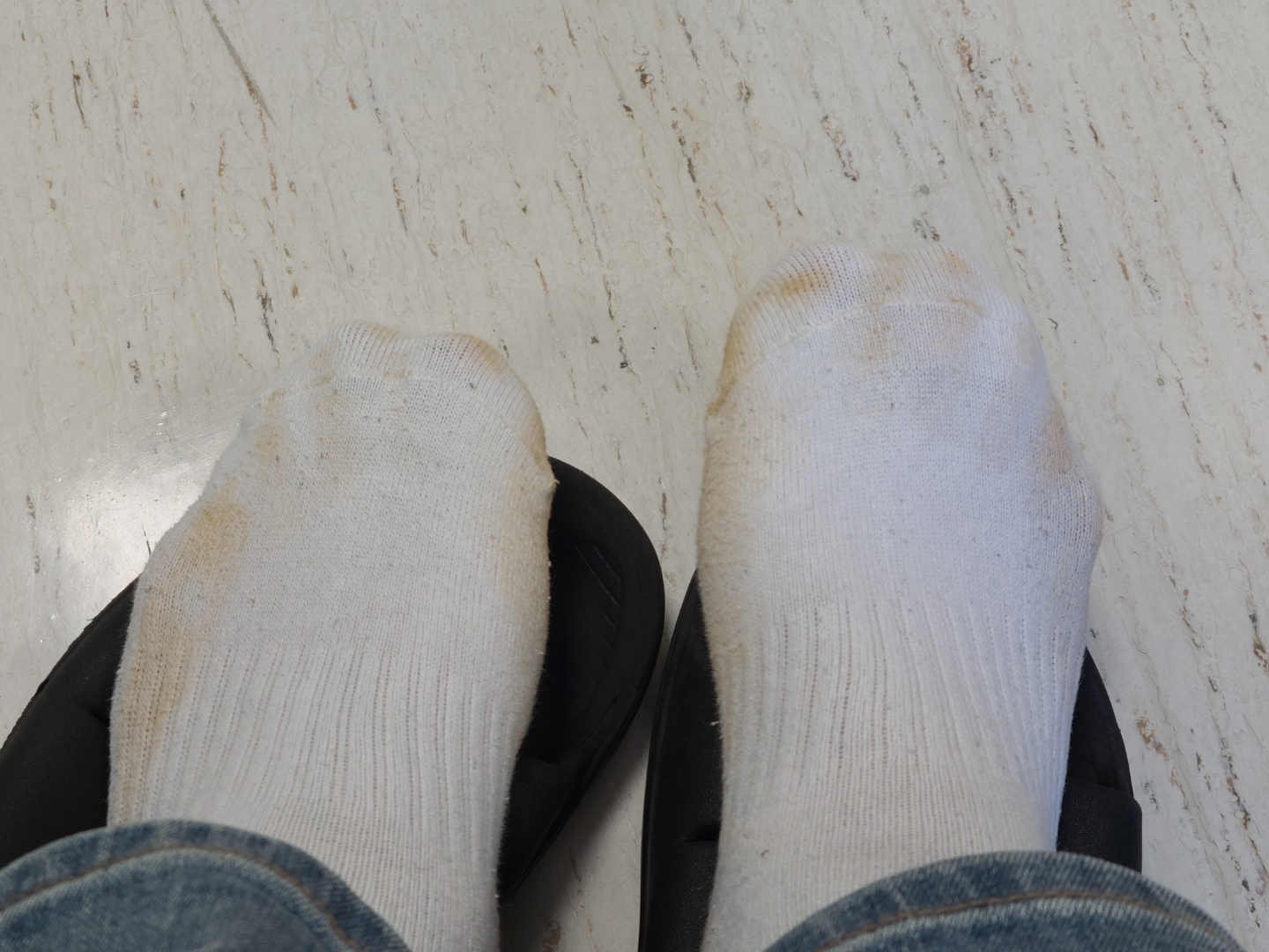 출근해서 자리에 오니 흰색 양말에 이렇게 이염이 되었습니다.