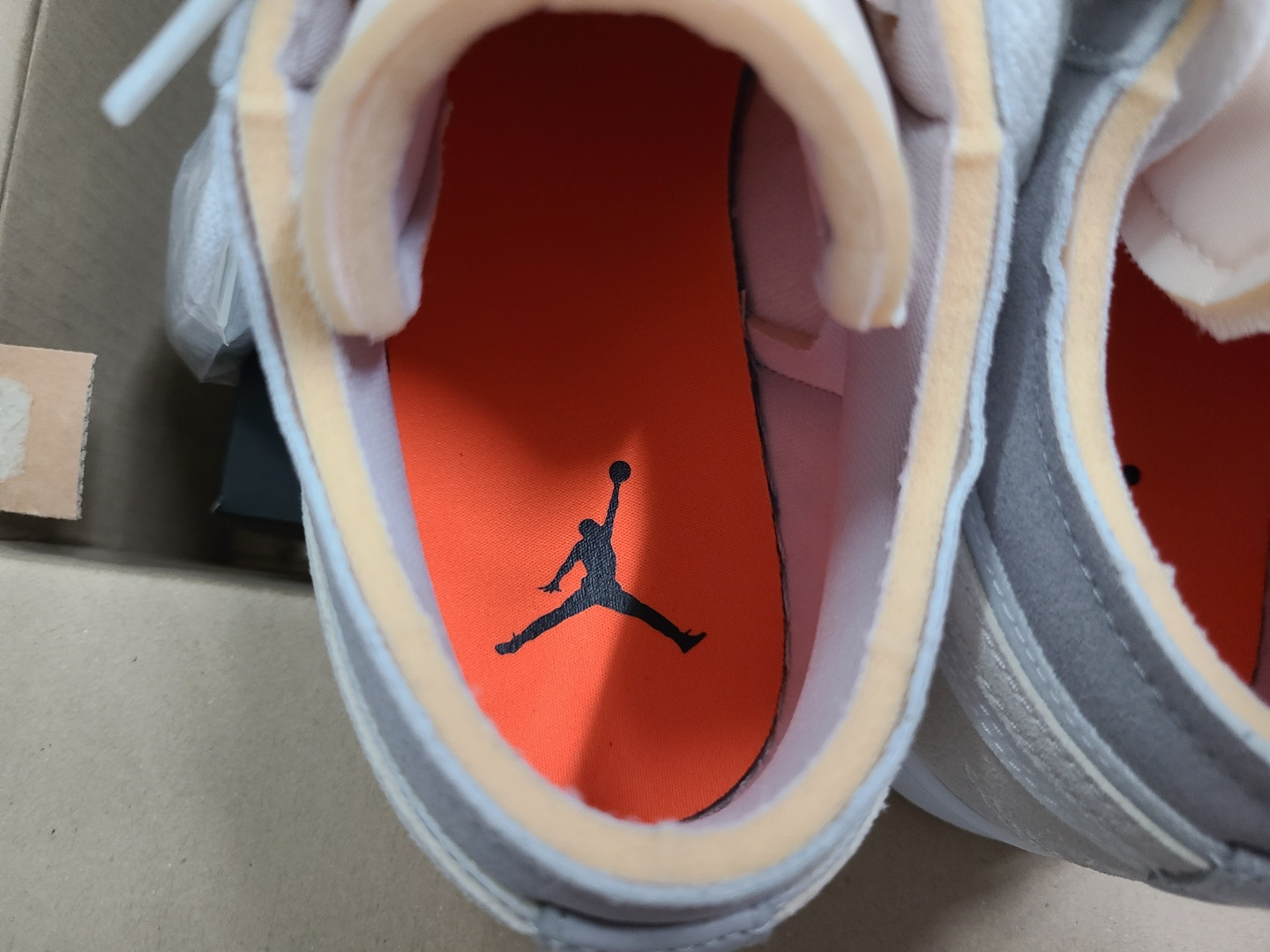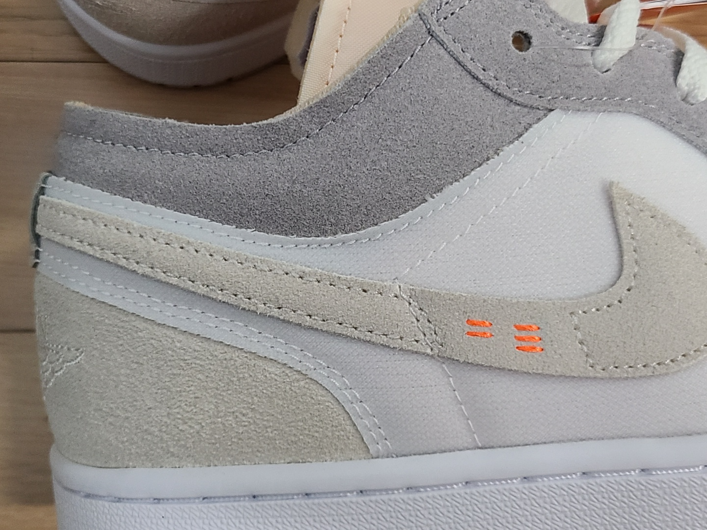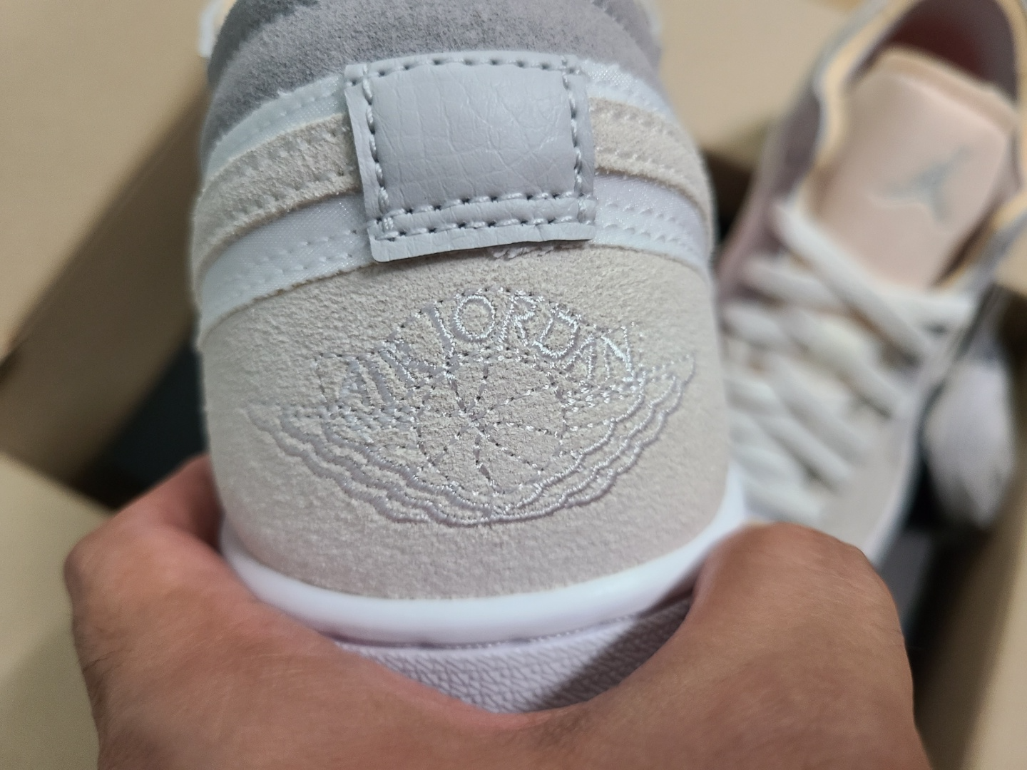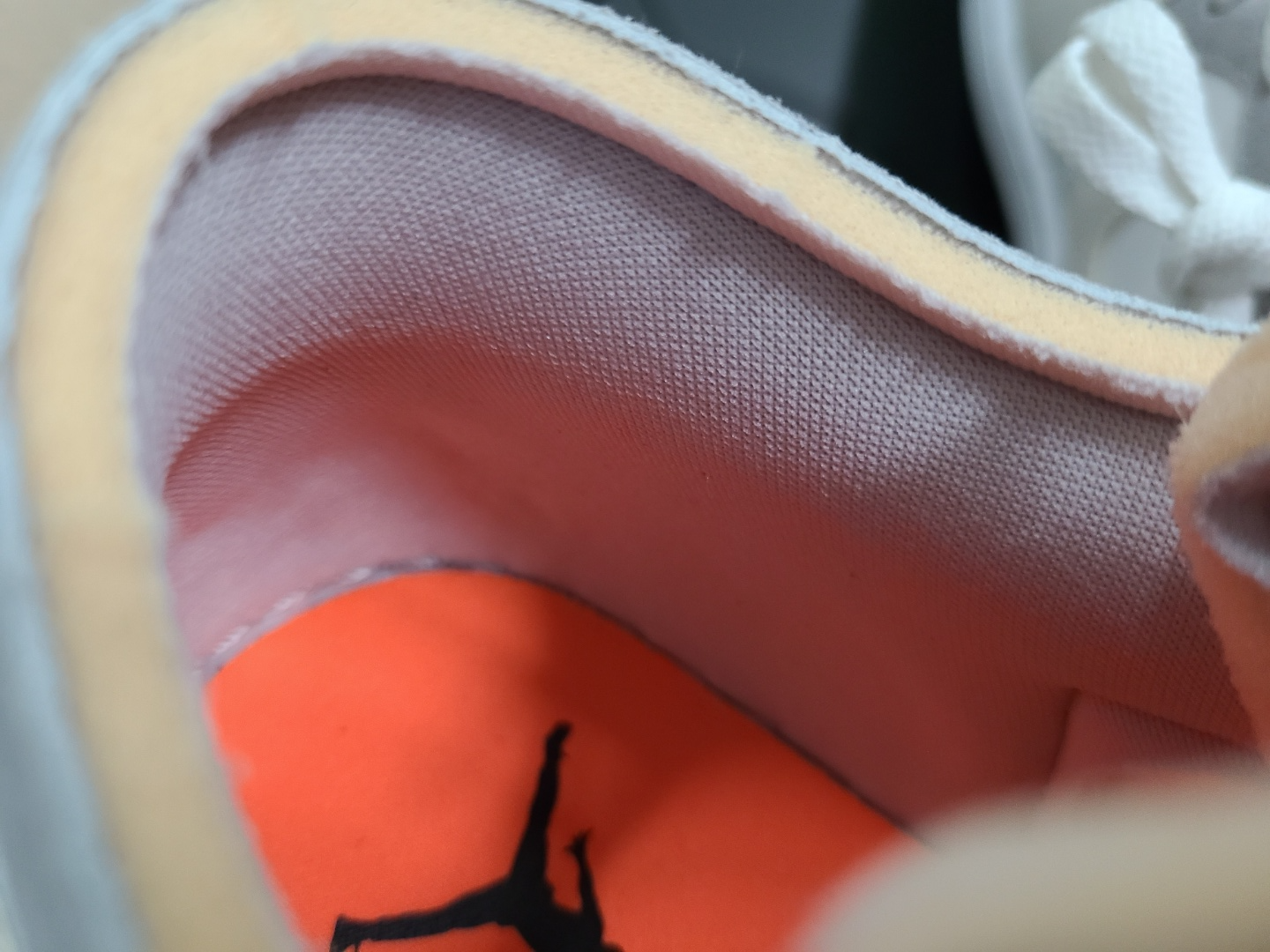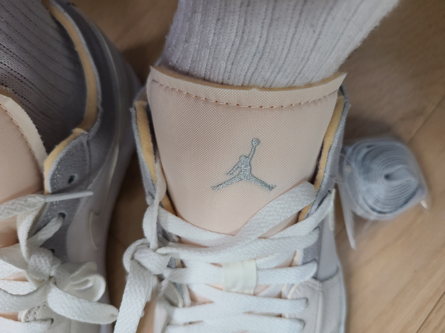 뒷꿈치에 에어조던 로고도 가죽을 덧대고 그 위에 올라가느냐, 아니면 가죽 없이 아래에 내려가느냐로 차이가 있습니다.