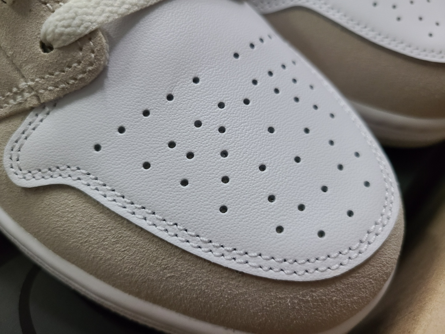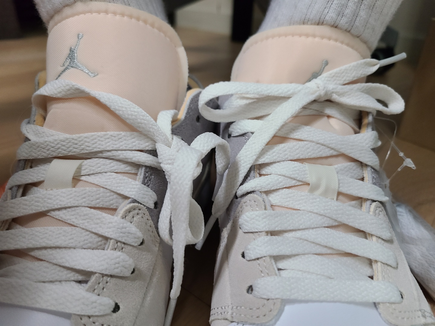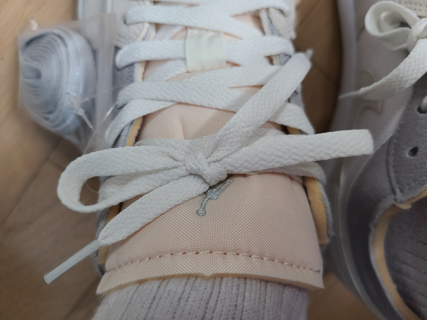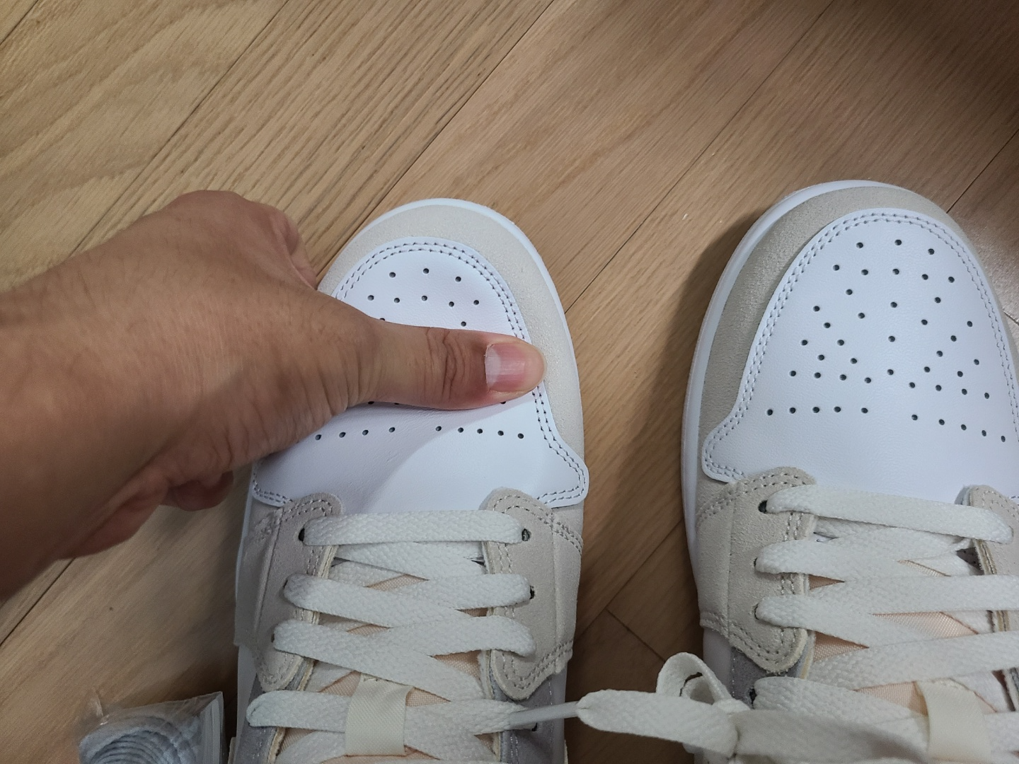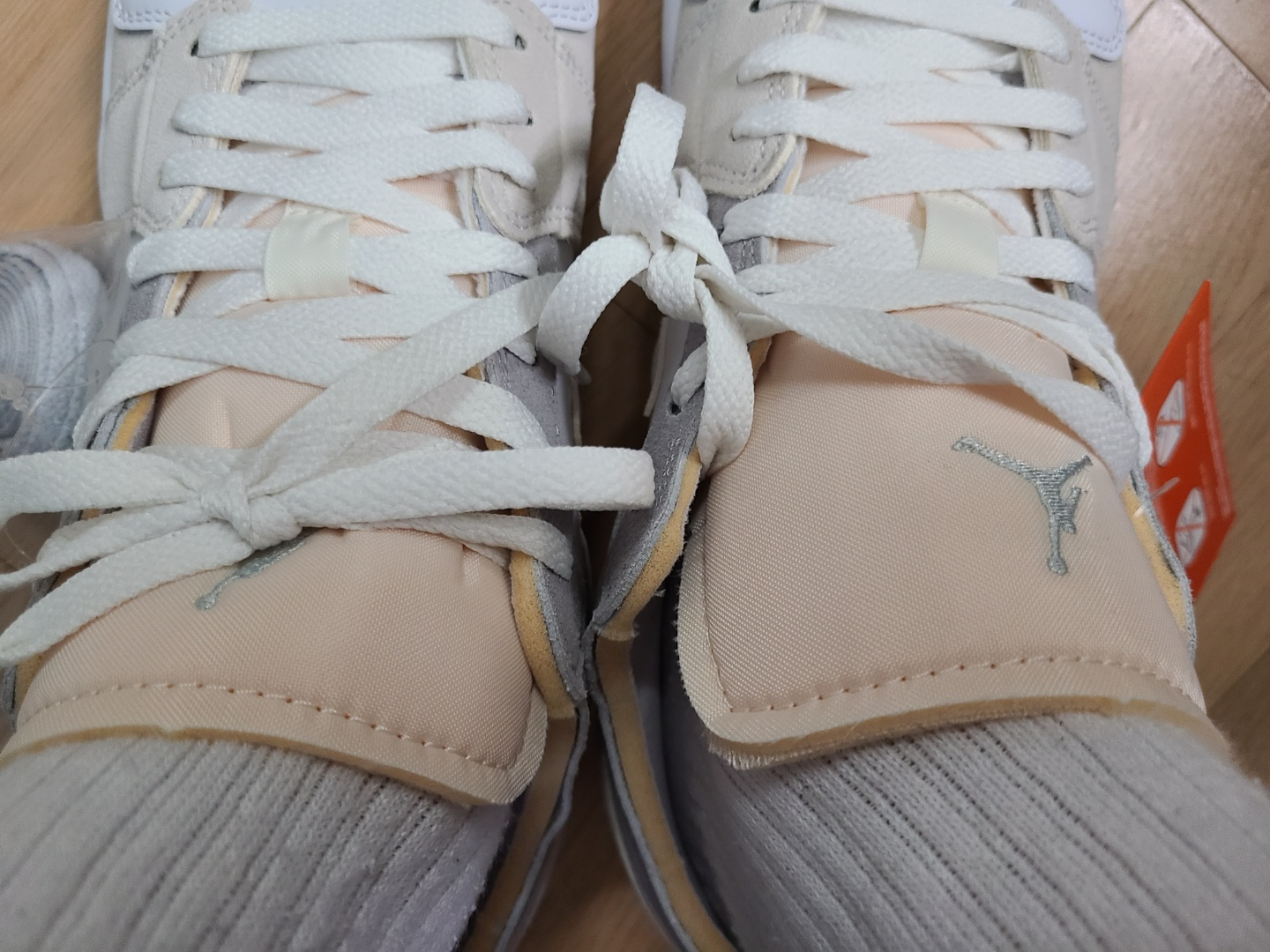 뒷꿈치에 에어조던 로고도 가죽을 덧대고 그 위에 올라가느냐, 아니면 가죽 없이 아래에 내려가느냐로 차이가 있습니다.
