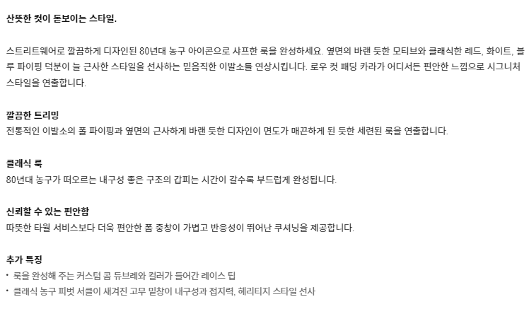 바버샵이란 별명에 맞는 디테일이 여기저기 숨어 있고, 하늘색 아웃솔이 상큼함을 더해줍니다.