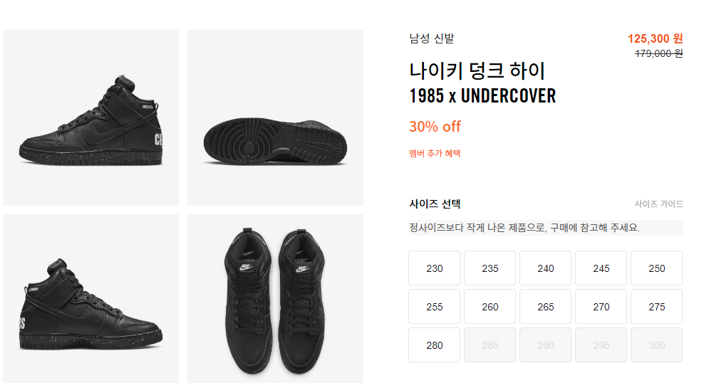 혹시 나이키의 콜라보 제품을 찾고 있으시다면, 무난한 블랙 컬러의 신발을 찾고 있으셨다면, 나이키와 언더커버의 디자이너 다카하시 준이 콜라보 한 덩크 하이 1985 모델을 추천합니다.