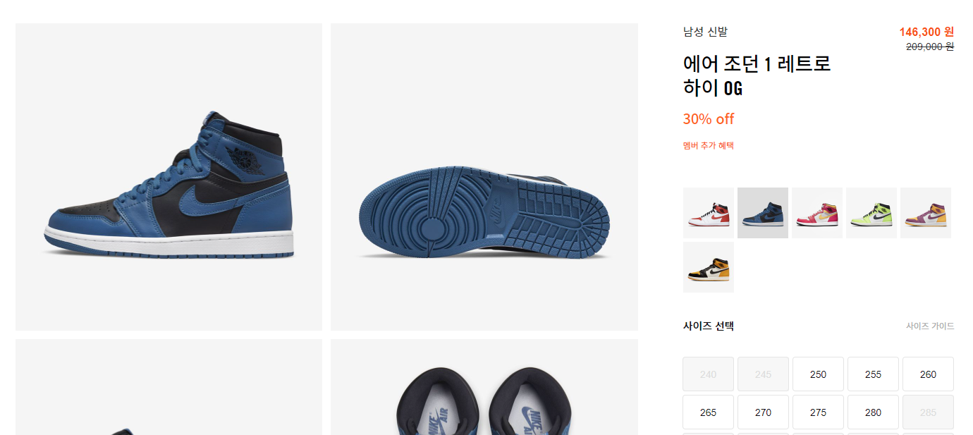 인기있는 콜라보 제품도 아니고 시그니처 컬러를 사용한 제품도 아니지만, 조던1 하이 모델을 한 번 경험해보고 싶다라고 생각하시는 분들께는 이번 할인이 좋은 기회라고 생각됩니다.