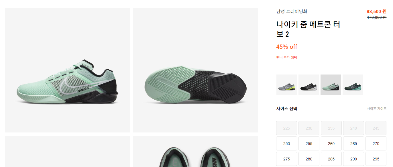 나이키 줌 메트콘 터보2는 색상별로 15~45%의 할인율을 보이고 있습니다.