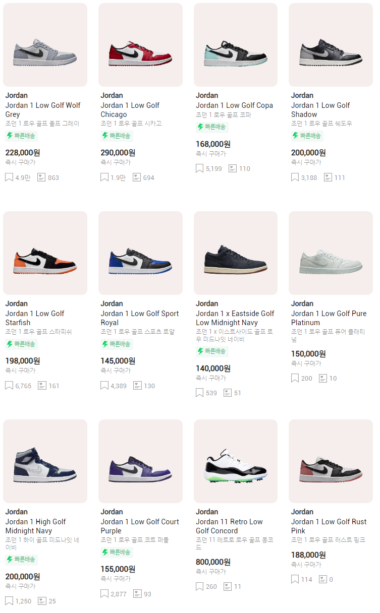 농구화로 왠 골프? 하는 생뚱맞은 생각과는 다르게, 이미 스니커 문화의 아이콘이 된 조던1 로우 골프 모델은 큰 인기를 얻었고, 일부 모델은 리셀가가 두배 세배 오를만큼 폭발적이었습니다.
