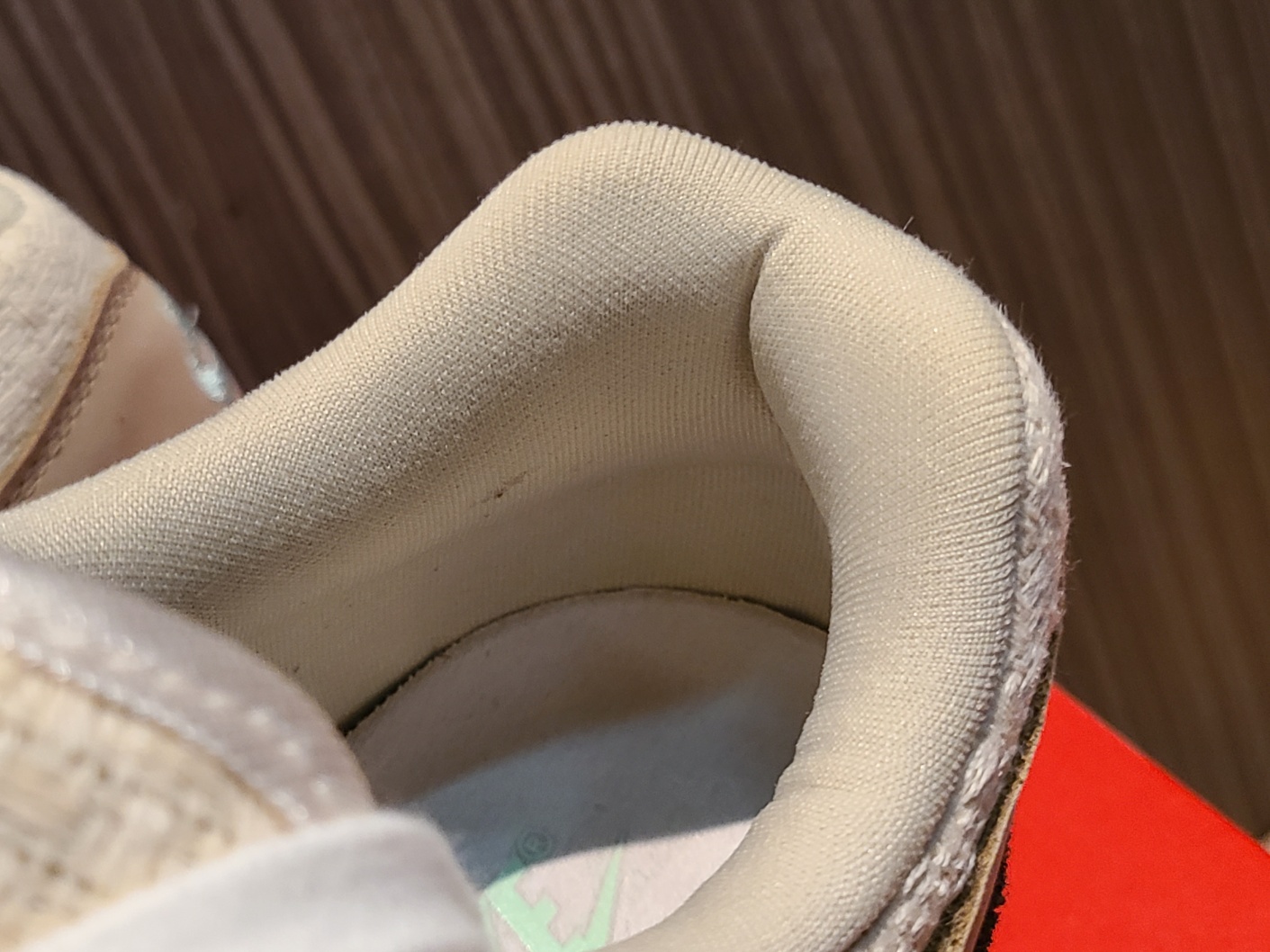 뒷꿈치쪽에도 민트 컬러 자수로 나이키 스우시와 에어가 적혀 있습니다.