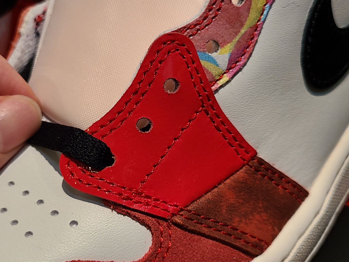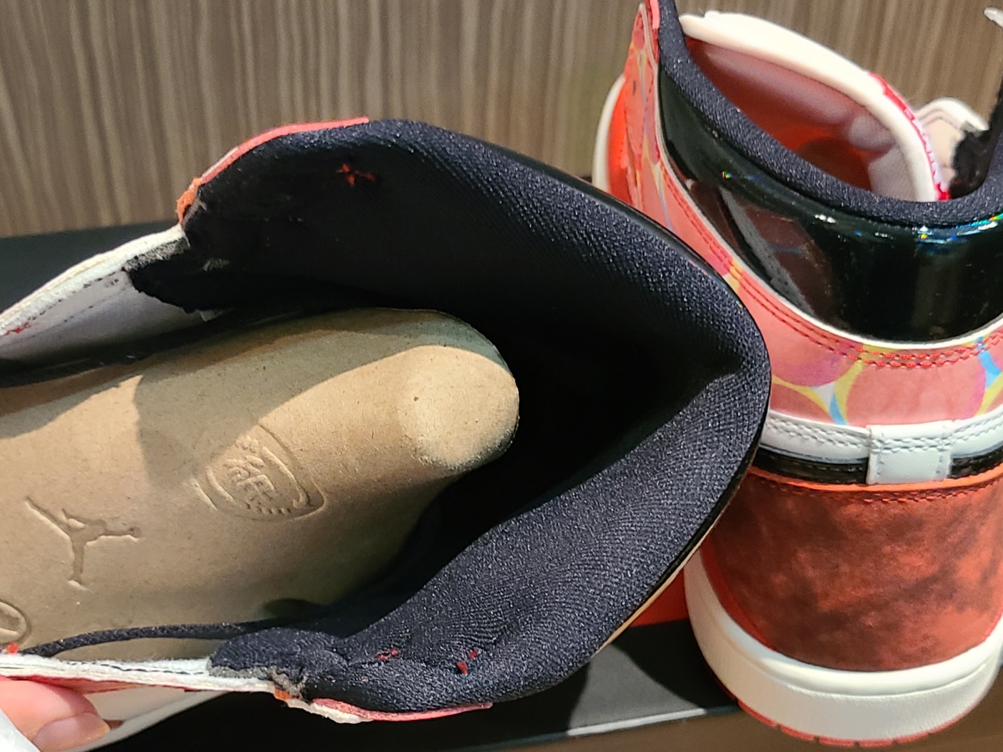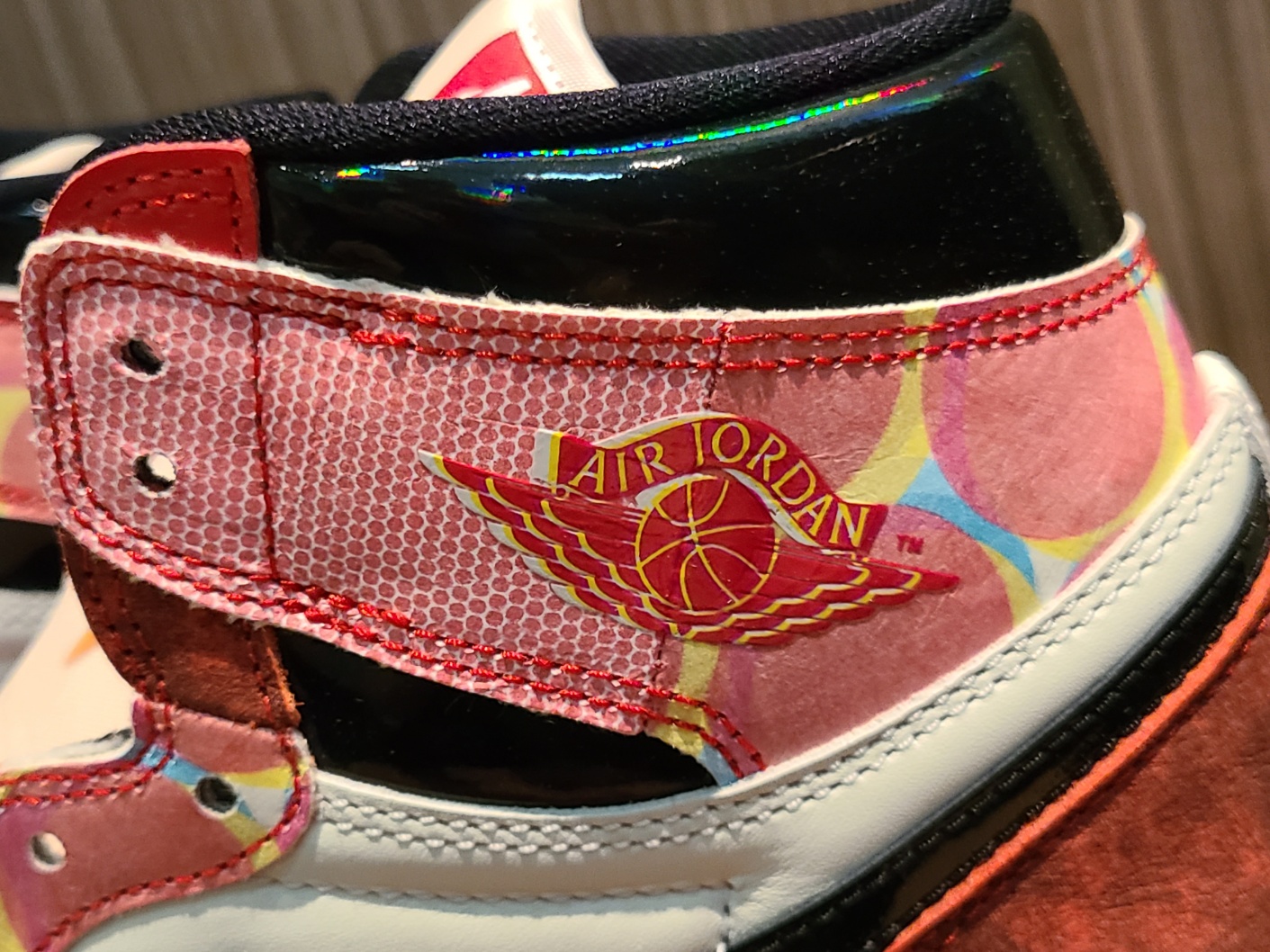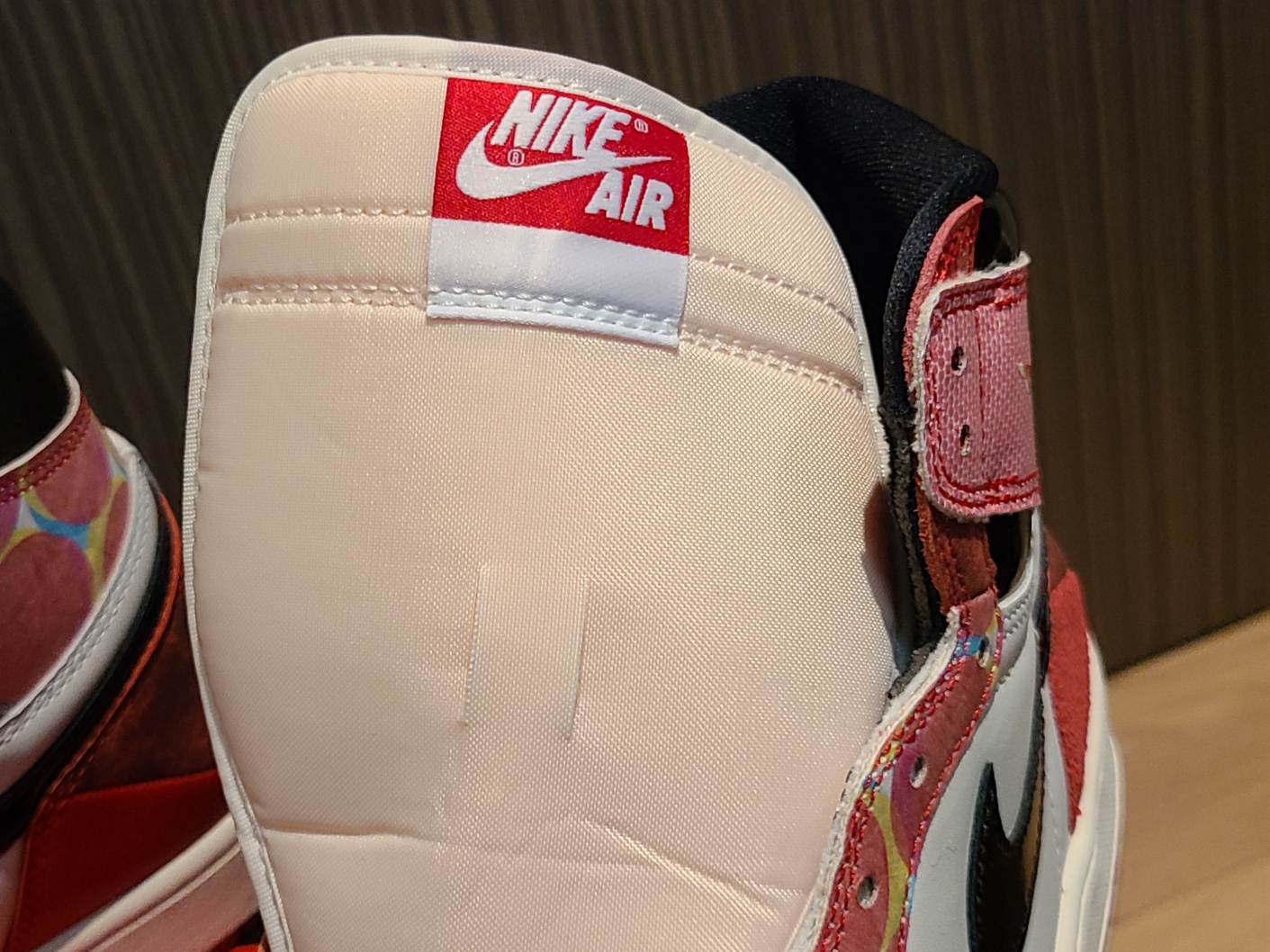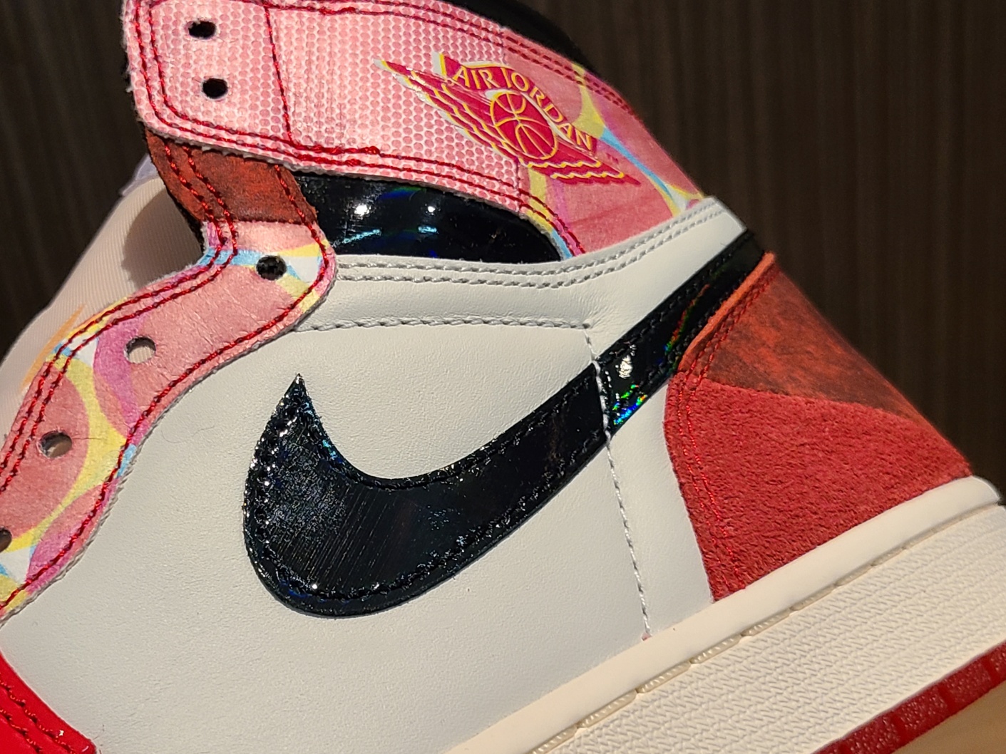 상단 패널이 두개로 쪼개지면서 스티치가 가로지르고, 컬러 프린팅이 들어갔기 때문에 에어 조던 로고를 프린팅으로만 해결 할 수 밖에 없었던 것 같은데, 나이키라면 얼마든지 다른 방법으로도 할 수 있지 않았을까요?