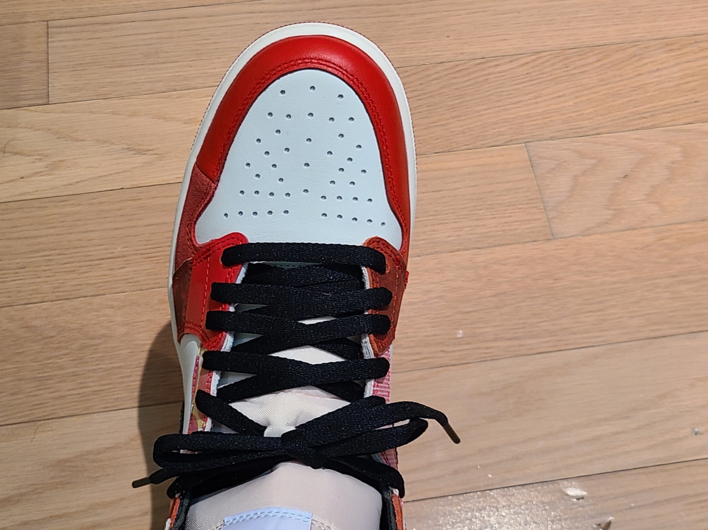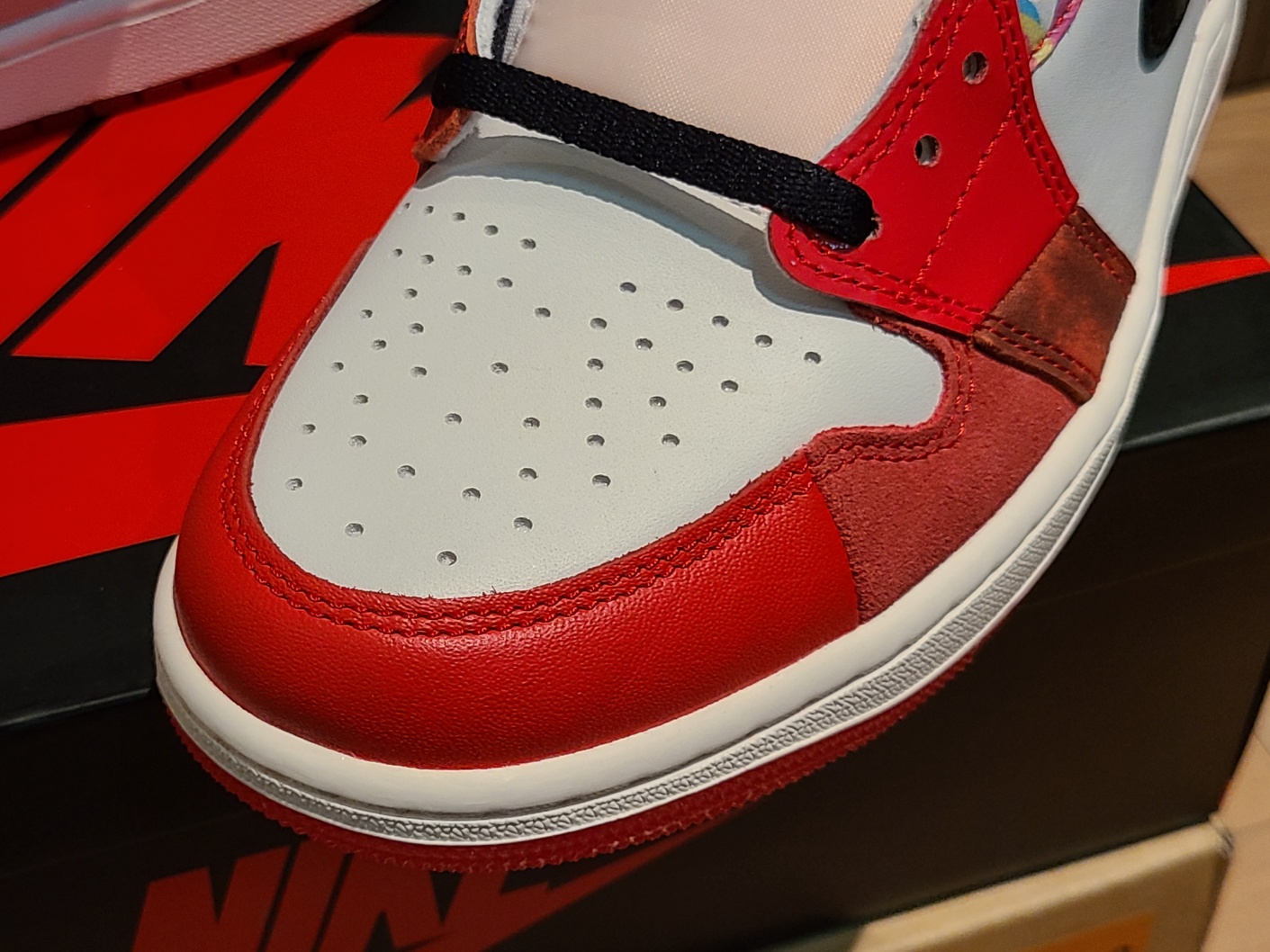 이번 조던1 하이: 넥스트 챕터는 전체적으로 인기 있는 레드 + 화이트 + 블랙 컬러 조합에 다양한 재질과 패턴으로 개성을 살린 신발이라 생각합니다.