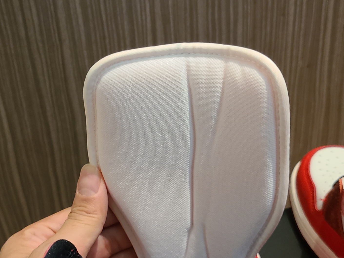 신발 안쪽은 전체적으로 비슷하지만 슈레이스가 지나가는 부분과 그 아래의 소재가 바깥쪽과 뒤바꼈습니다.