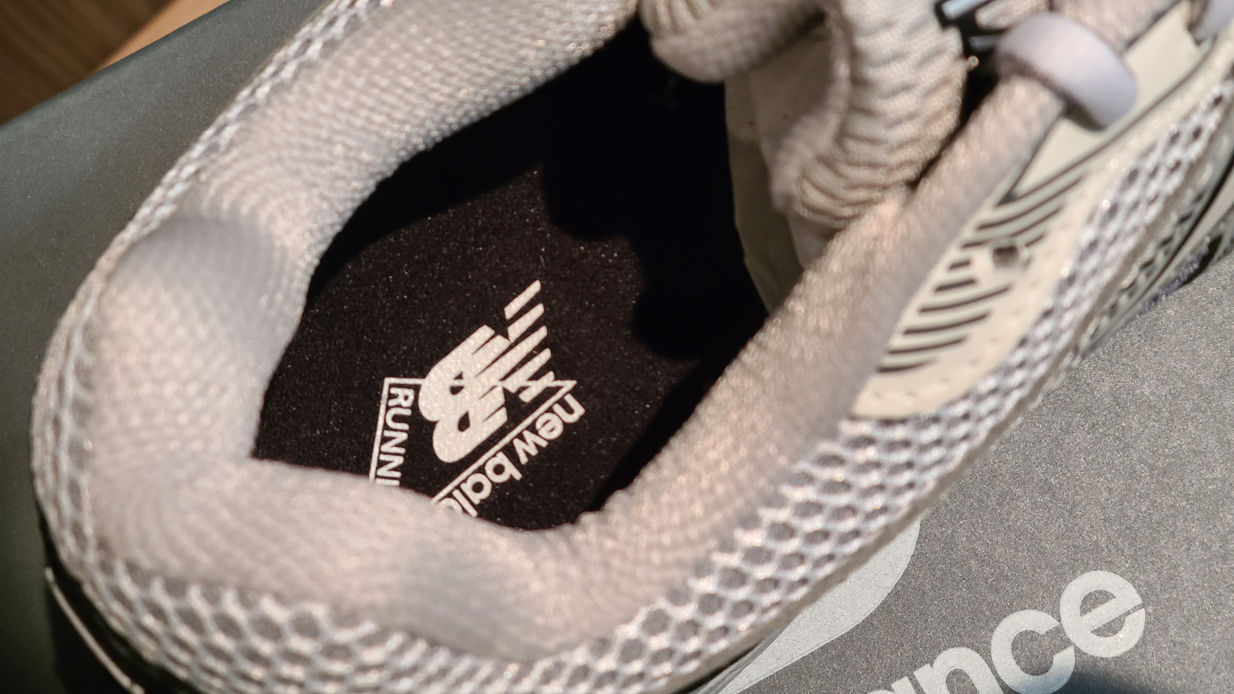 힐컵에 빨간 뉴발란스 로고가 유일한 유채색입니다