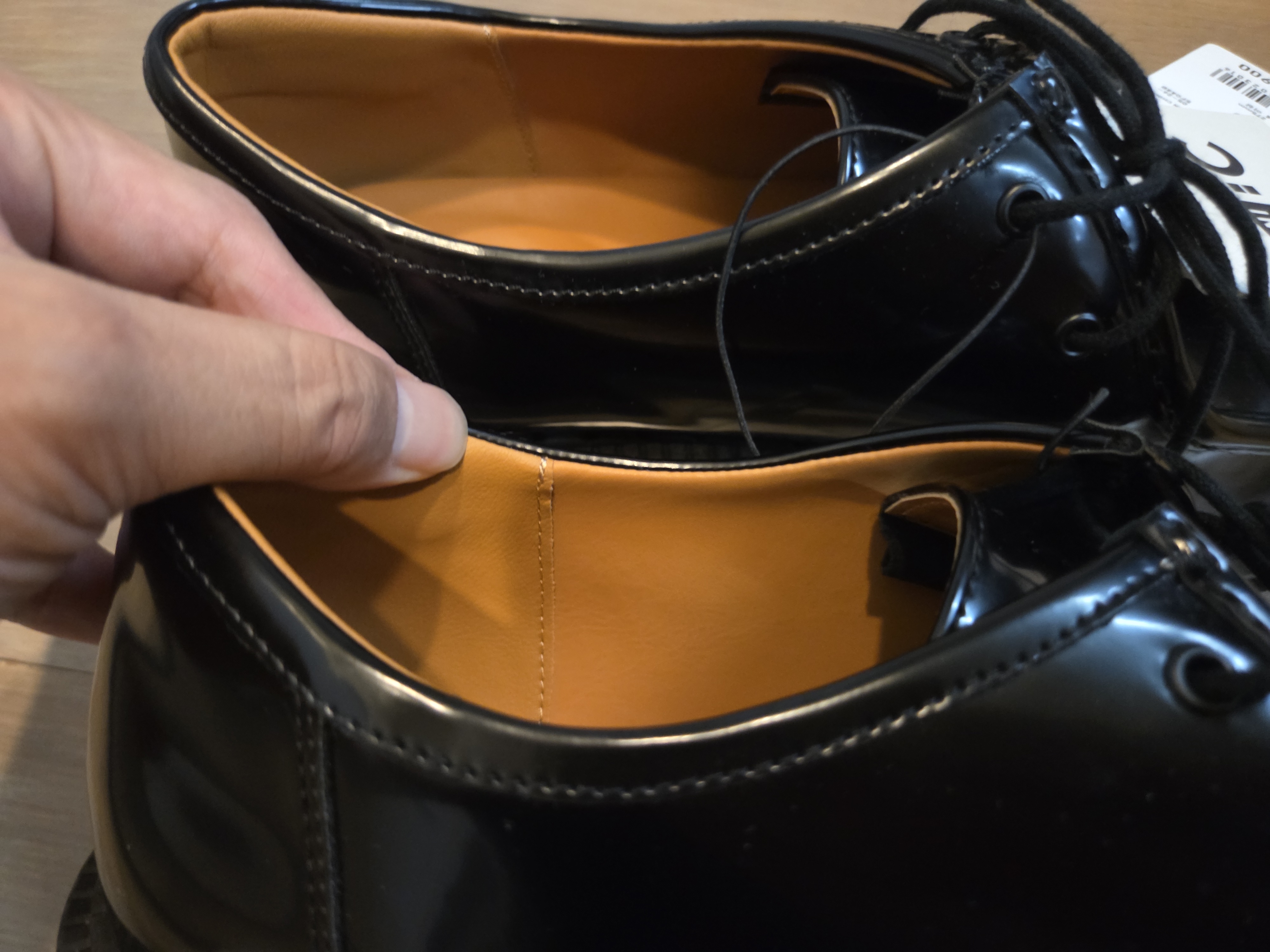 인솔은 도톰한 쿠션감이 느껴집니다. 마치 가죽처럼 보이는 색상이지만, 이 가격에 그럴리가요, 합성 가죽입니다.